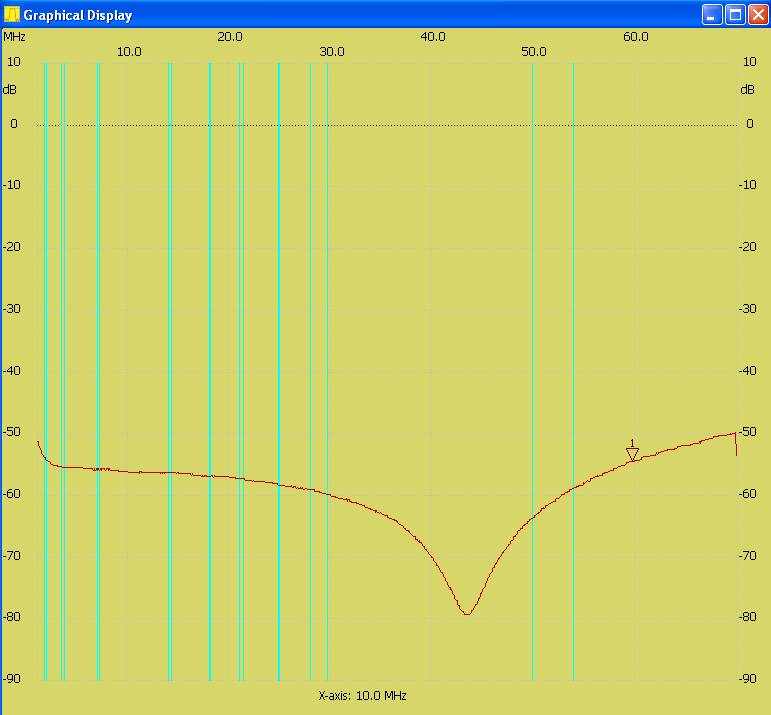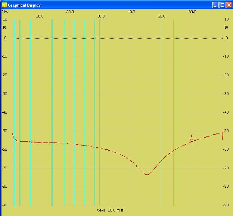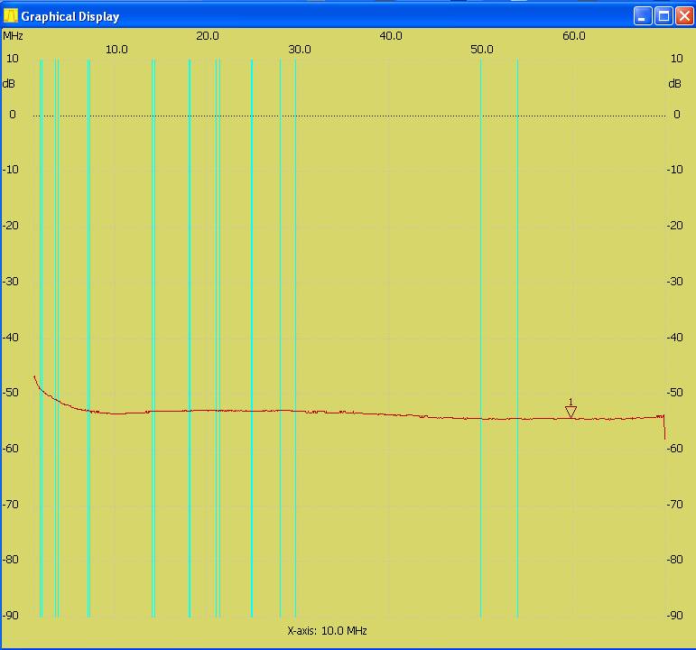 jak widac od 3MHz do konca ( 70MHz) mamy lekko ponad 40dB ( a wiec dokladnosc pomiarow z bledem ponizej 2%) ...wykres lekko zafalowany ale to juz w efekcie beda setne czesci % .