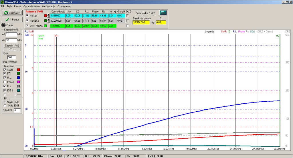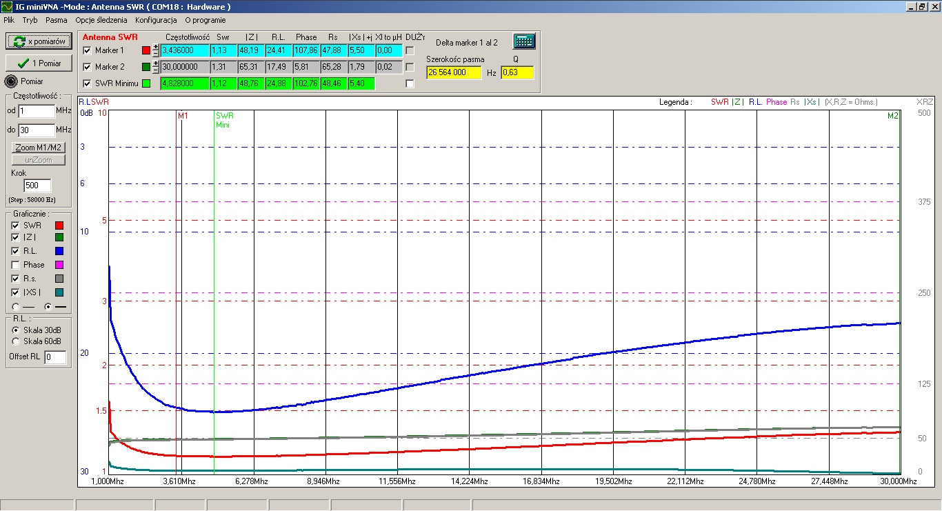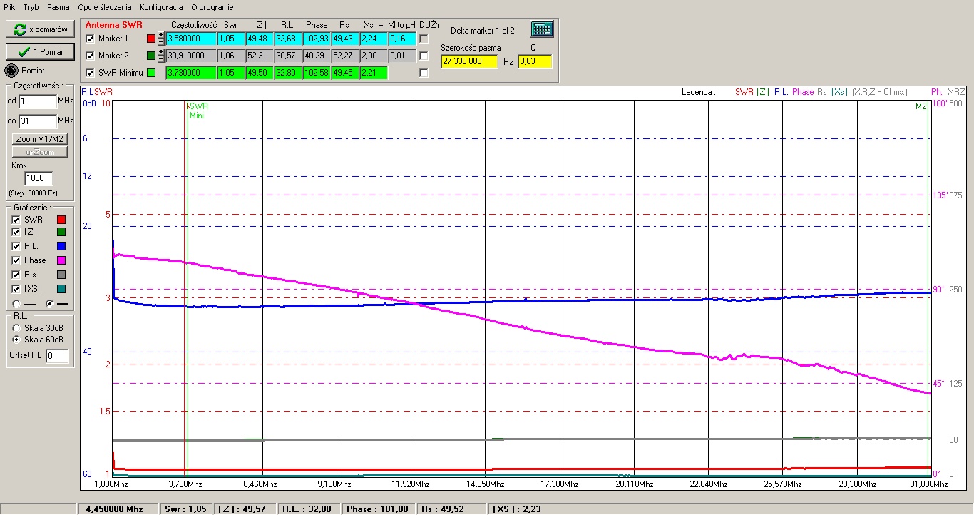 Balun idealny chyba jednak nie był idealny ponieważ współczynnik R.L. (Return Loss *1 - straty odbiciowe - patrz na koniec) cały czas utrzymywał się na poziomie około -30dB *2. To jest ta granatowa linia pozioma.