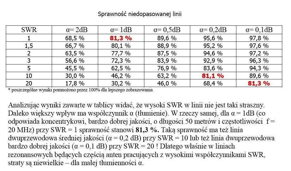 Powyższa tabelka pokazuje sprawność linii w zależności od SWRa i strat w linii. Dla dobrej linii koncentrycznej (a=1dB) różnica pomiędzy SWR 1 a 1,5 wynosi 1.2%, czyli do pominięcia. Polecam lekturę całego tekstu.