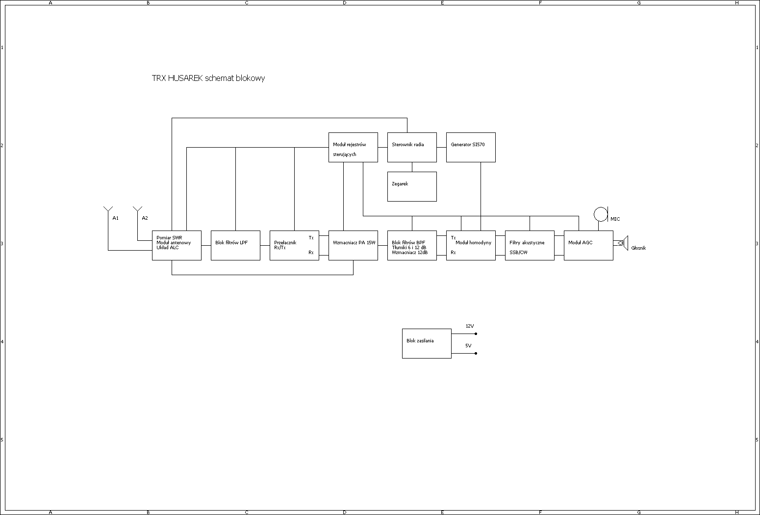 Poniżej zamieszczam poglądowy schemat blokowy TRX HUSAREK. Schemat ilustruje moduły funkcjonalne z których składa się budowane radio.