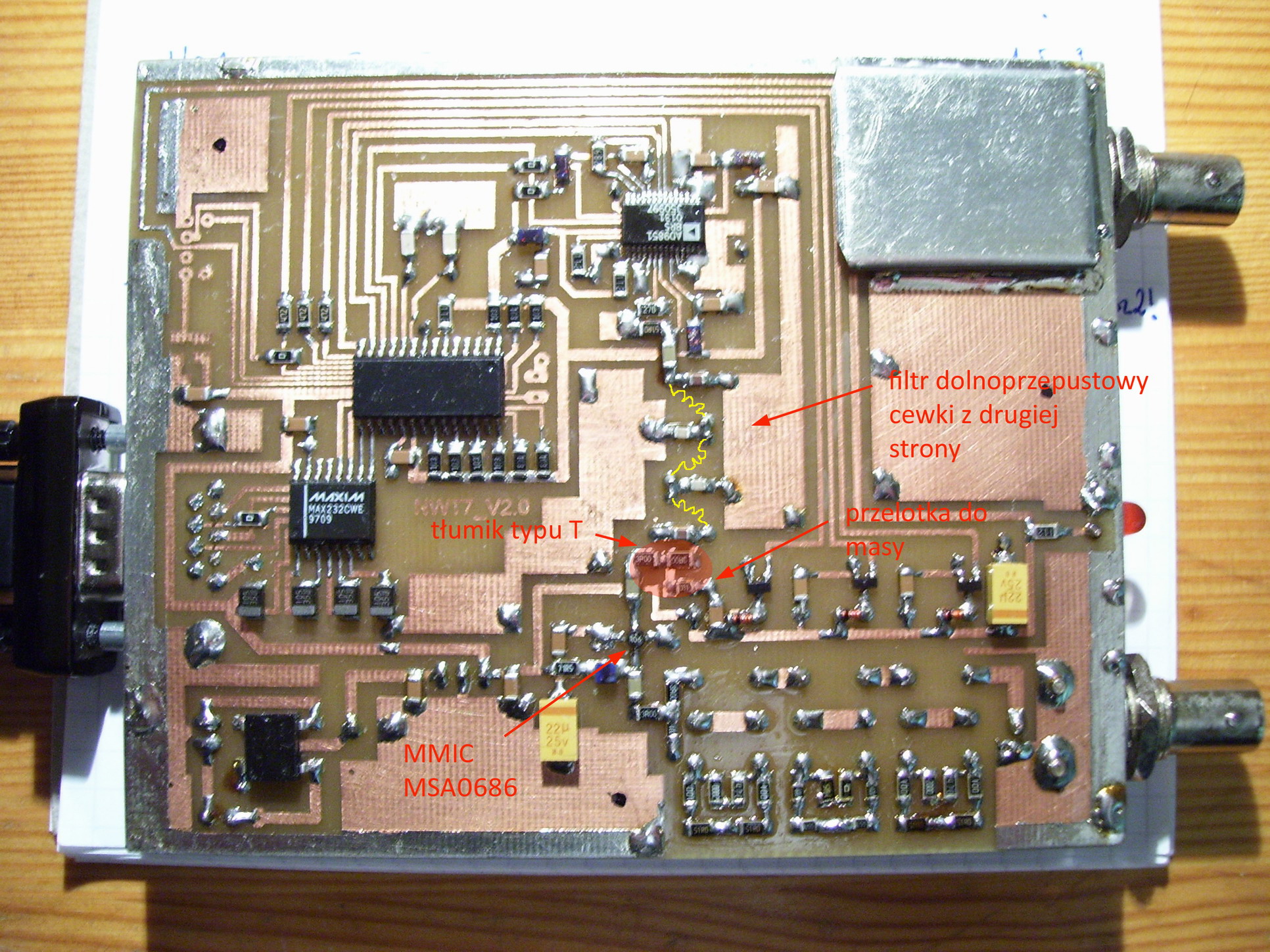 Powracając do Twojego poprzedniego postu odnośnie sprawdzenia filtru LC, domyślam się, że chodzi o filtr między DDS a MMIC. W schemacie ze "Świata radio" jest tam dwuobwodowy filtr LC zakończony tłumikiem typu Pi, na płytce natomiast jest filtr trzyobwodowy zakończony czymś co wygląda jak tłumik typu T. Nie znam oryginalnego schematu płytki co do tego fragmentu. Sprawdzenie polegało by zapewne na pracy NWT w trybie generator i pomiarze tłumienia.
