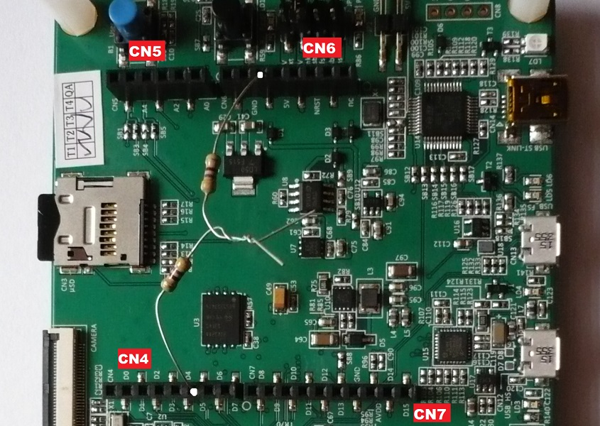 W końcu udało mi się połączyć wszystkie informacje razem i połączyłem dwa piny na Disco rezystancją około 1k dla bezpieczeństwa jak zalecał kolega z forum.Konkretnie skręciłem dwa rezystory 470R/0.25W ze sobą a ich wolne wyprowadzenia wetknąłem w złącza CN4 i CN6 jak na zdjęciu: