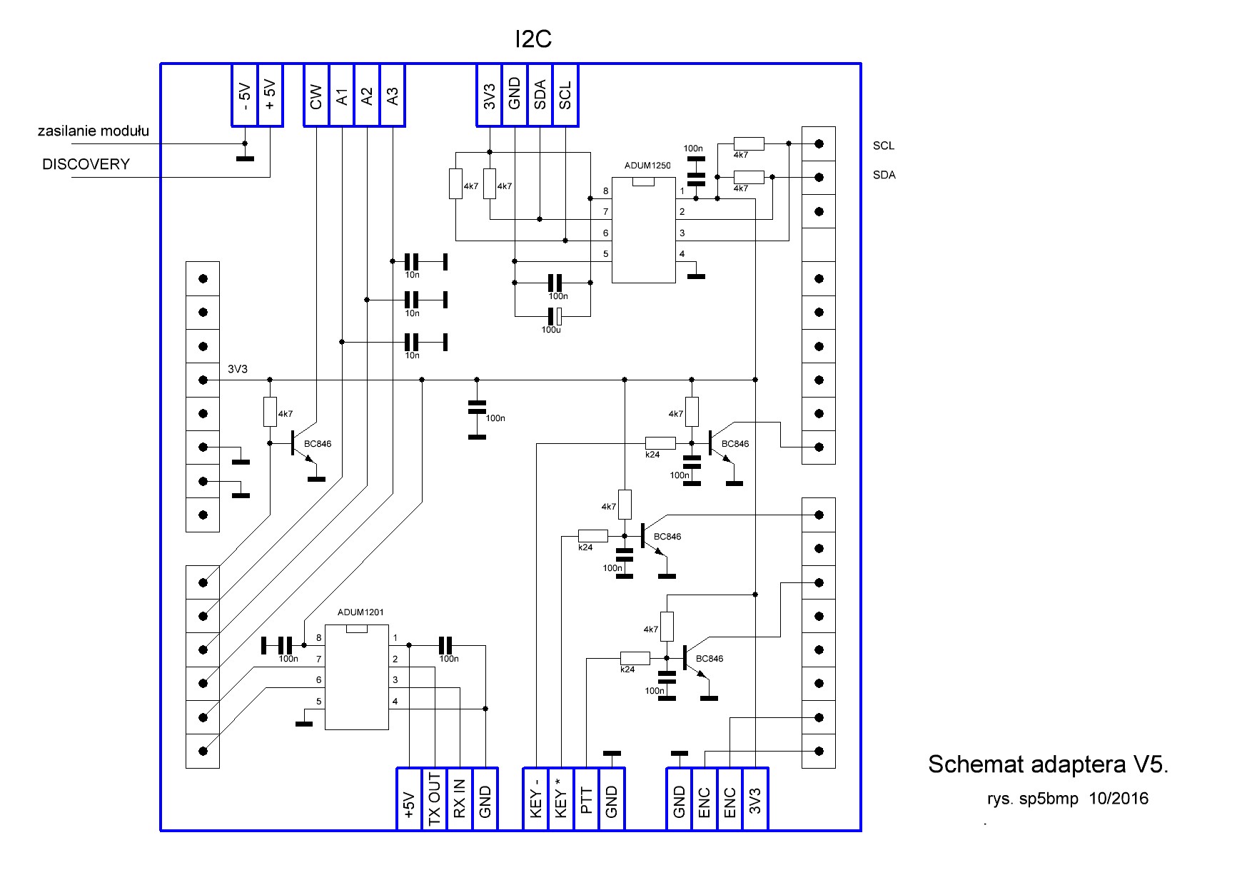 Szanowny kolego, dziękuję za miłe słowa w imieniu swoim i Tomasza. Proszę spojrzeć na schemat adaptera zamieszczony poniżej. Widać na schemacie, że w stanie nie aktywnym są zwarte poprzez tranzystory trzy wejścia procesora. Są to PTT, KEY * i KEY -. Taka logika została wybrana aby zabezpieczyć wejścia procesora przed ładunkami elektrostatycznymi jak i wcz. Bez tego układ jest w stanie nadawania i nie reaguje na sterowanie. Co się tyczy enkodera to testy były robione na enkoderze Copal RMS20-250 . Jest to enkoder magnetyczy o 250 impulsach na obrót. Wymaga on typowego zasilania +5V ale działa też na napięciu 3,3V. Program Husarka DSP powinien działać i na enkoderze mechanicznym, wtedy podłączamy masę i dwa wejścia. Proponuję zbudować płytkę adaptera aby do niej podłączać zewnętrze akcesoria. Powodzenia w budowie życzę, Janusz.