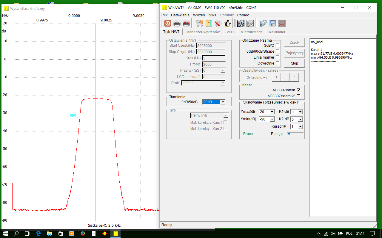 Kolejne etapy pracy przy badaniu PM-9-4F1 wykazały, że przyczyną słabych wskazań analizatora NWT7, którym sprawdzałem filtr były złe kontakty masy płytki z obudową pomiarowego boksu i samym filtrem również. Jutro to poprawię. Może jeszcze się coś na lepsze w tej charakterystyce zmieni. Większe niż poprzednio zafalowania w górnej części charakterystyki najprawdopodobniej wynikają z faktu, że o połowę zmieniłem ilość zwojów transformatora pozostając jednak przy tej samej przekładni. Obecnie w transformatorkach mam 1 zwój po stronie pierwotnej oraz 4 zwoje po stronie wtórnej.