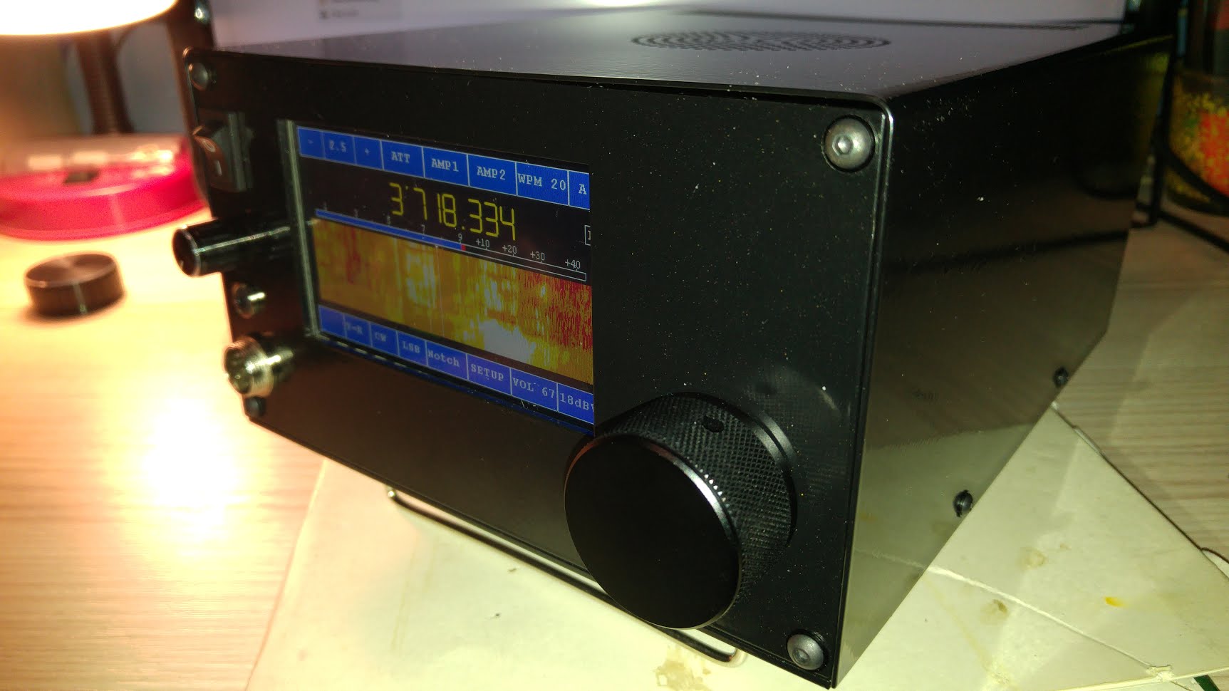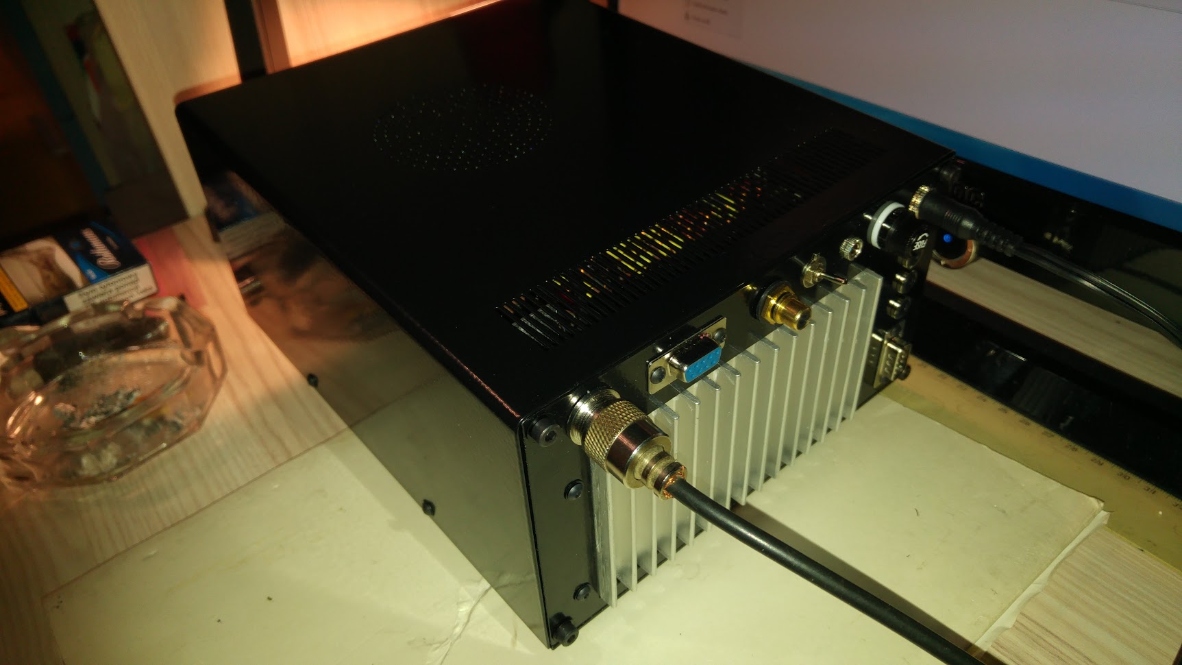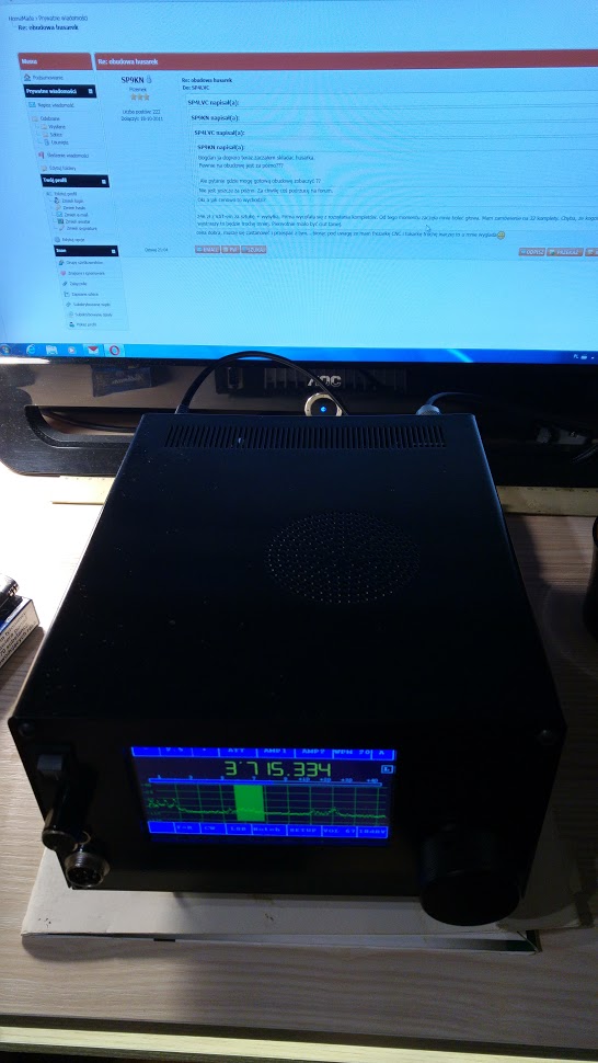 Coś powoli się wyłoniło. Już nawet zrobiłem pierwsze łączności, ale w dalszym ciągu powolutku łączę kabelkami wszystkie potrzebne gniazda i styki. Dziś przyszła ładniejsza gałka do enkodera - zmienię wieczorem jak wrócę z pracy. Założę podłogę, pokrywę i cyknę nowe fotki. Jakoś tak nie było okazji ,,ubrać" go do końca, bo całe święta (w ramach wolnego czasu od gości i stołu) skręcałem blachy i lutowałem połączenia. Przy składaniu robię notatki z poprawkami dla ,,biura konstrukcyjnego", które prawdopodobnie jutro zostaną przekazane do firmy. Głównie chodzi o lekkie powiększenie średnicy niektórych otworów, gdyż przy malowaniu w otwory jest zasysana farba i zmniejsza ona ich średnicę. Za pierwszym włożeniem śrubki trzeba w nią wkręcać (farbę) - potem jest lżej. Wynikła też konieczność powiększenia głębokości obudowy o 10 mm w jej tylnej części. Elementy PA prawie dotykają powierzchni tylnej płyty montażowej - chodzi głównie o przerobiony transformator wyjściowy na rurkach i koncentryku 25 Om. Jest wyższy niż ten na rdzeniu dwuotworowym. Tym samym o 10 mm zwiększy się też głębokość pokrywy i całego urządzenia.