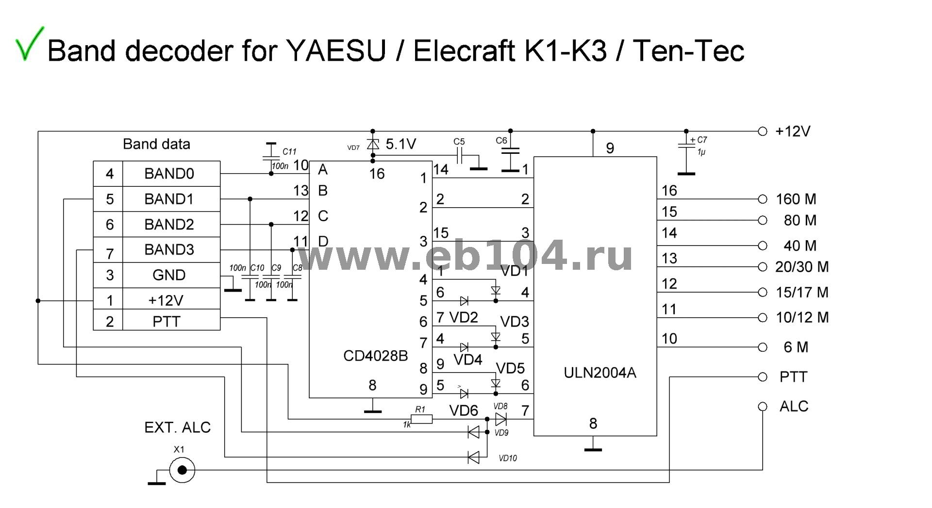 Na rezystorze R1 i diodach VD8, VD9, VD10 jest zrobiona bramka logiczna AND, która załącza pasmo 6m dla numerów 10, 11, 14, 15. (BAND[3-0]).