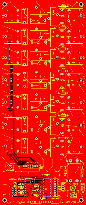 Panowie podzielcie się swoimi przemyśleniami - czy to ma szansę działać w przedstawionej konfiguracji, czy zaprojektować na PCB normalny układ, który jest od początku do końca ,,logiczny"? W ostatnim pliku płytka LPF po stronie Top. Rozmiar 234 x 98 mm. Nie dało się to zrobić mniejsze. Przekaźniki, kondensatory mikowe i pierścionki T-80 muszą mieć swój rozmiar przy tej mocy. Na dole po lewej stronie są ulokowane elementy układu banddekodera.