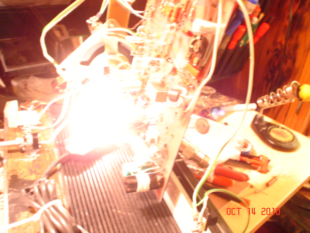 Układ m.cz. się wzbudza, ale nim zacznę coś przerabiać to zaekranuję VFO i poprowadzę kabelki w ekranach. Potem podłączę sygnał 1kHz na wejście i na wyjściu woltomierz i tak go dostroję żeby był czysty mocny sygnał. Albo UL1498 na zewnętrznej płytce.