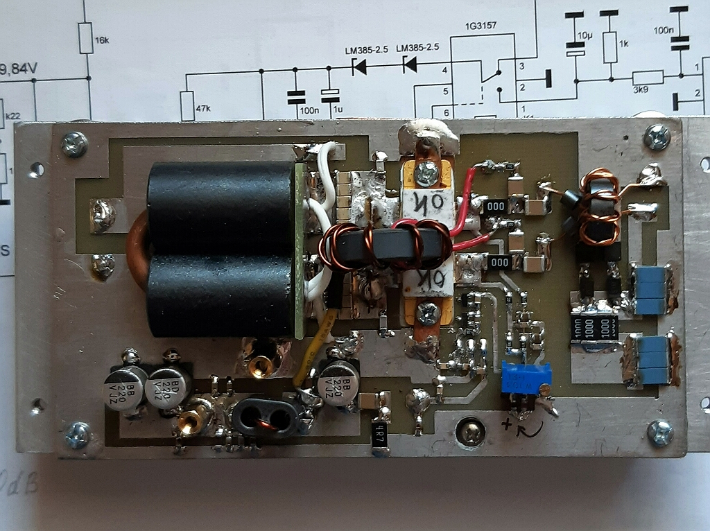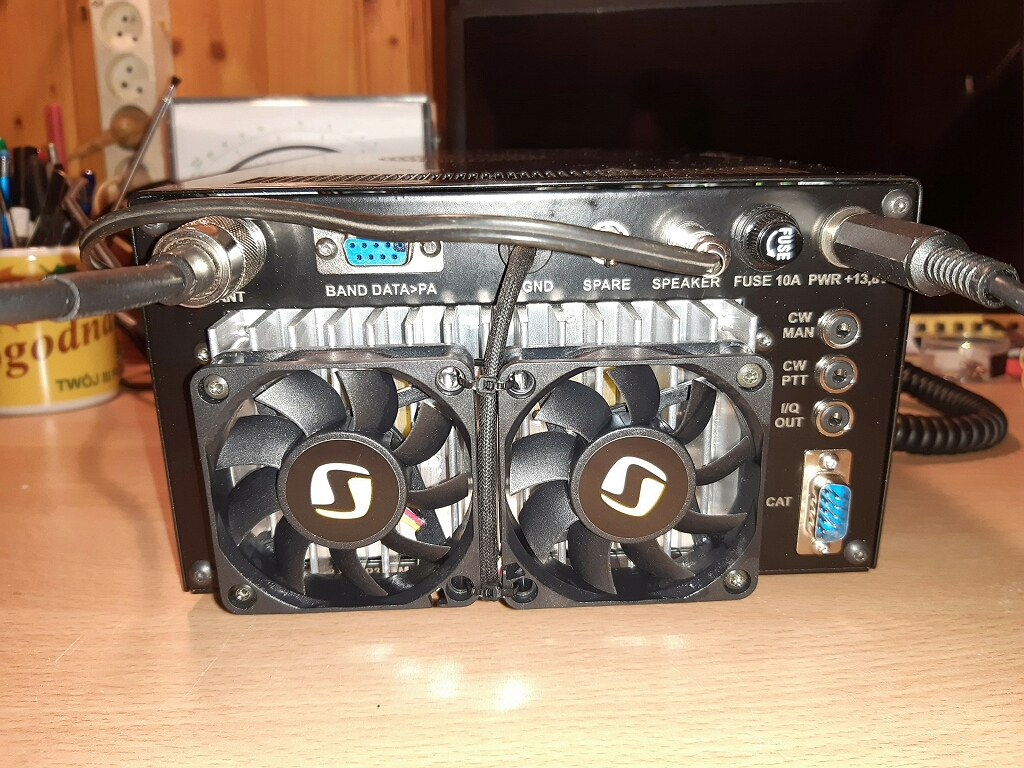Po ponad roku różnych modernizacji chyba (?) skończyłem swojego Husarka DSP. Główne modernizacje polegały na zamontowaniu skrzynki antenowej N7DDC i zwiększeniu mocy do ok. 100W, chociaż podczas prób bez problemu osiągałem 170W na wszystkich pasmach. Końcówkę wykonałem na D1028UK wg.SP9HVW a przedwzmacniacz na BFG591 + RH16HHF1. Napięcie zasilania końcówki to 25V i ok.10A przy maksymalnej mocy. Musiałem wyciąć okienko do wyświetlacza skrzynki i na radiatorze zamontować wentylatory, które pracują bardzo cicho.