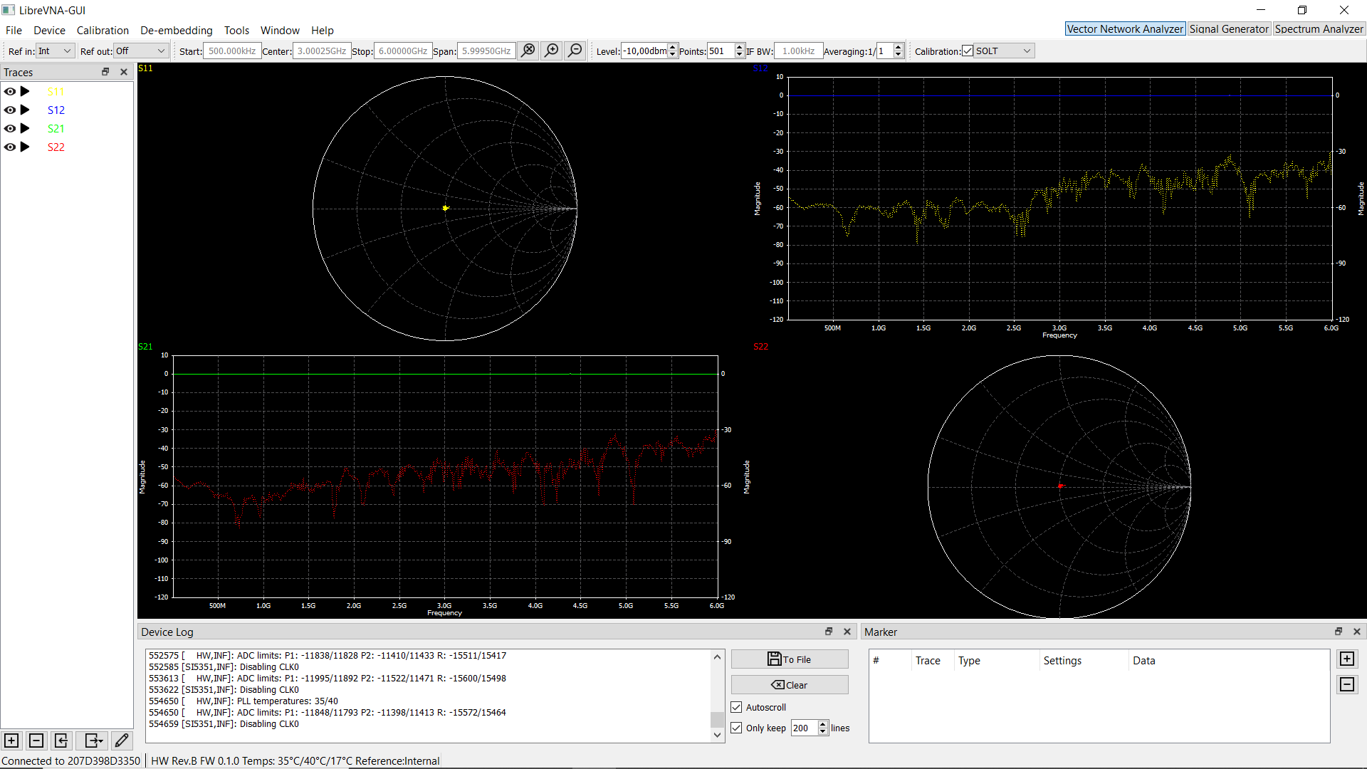 Cytat:Prócz pierwszego wykresu izolacji, gdzie mamy warunki możliwie bliskie pełnemu dopasowaniu, być może możliwości urządzenia w temacie pomiaru wysokich impedancji pokazałby również jakiś wykres np. z portami otwartymi i takim wyskalowaniem wykresu w pionie, aby możliwie dokładnie pokazać "zafalowanie" wykresów S11/S22 w okolicy 0dB oraz jaki mamy poziom "śmieci" wchodzących do urządzenia na podstawie S21/S12 w takich warunkach.
