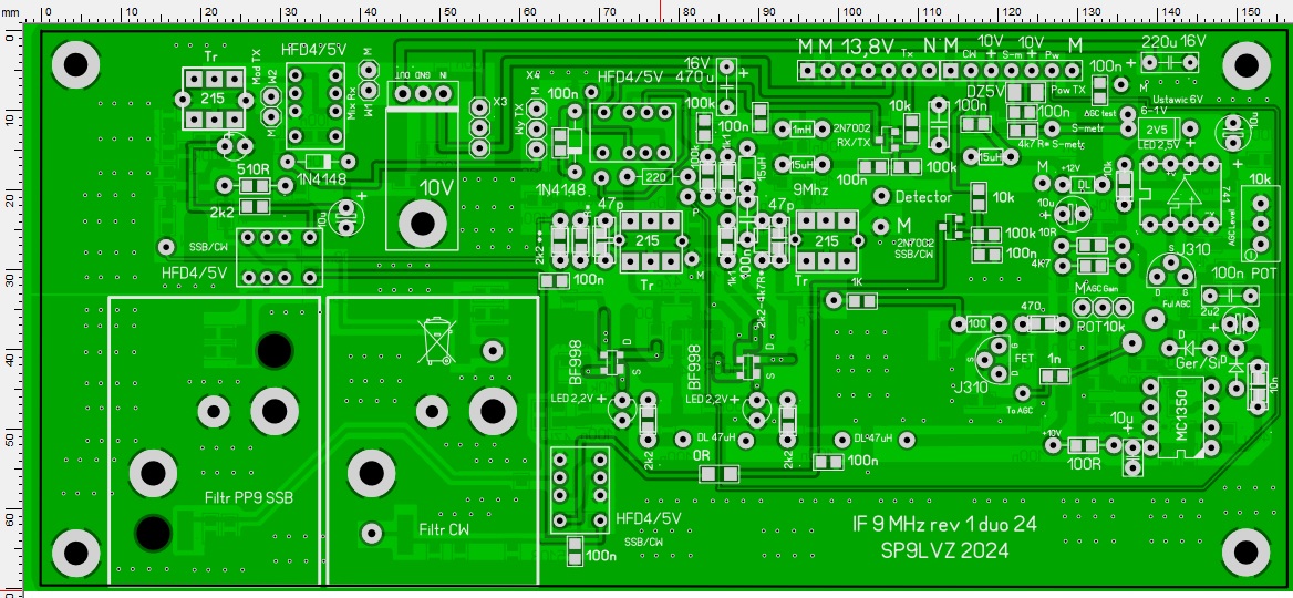 Do zestawu płytek będzie jeszcze wykonana PCB małego modułu wzmacniacza różnicowego potrzebnego do sterowania wskazówkowego miernika wychyłowego S-metr. Bezpośrednio sygnałem S-metr z płytki p.cz. na mosfetach nie da się sterować miernika wychyłowego. Wszystkie aktualne PCB będą w połowie lutego.