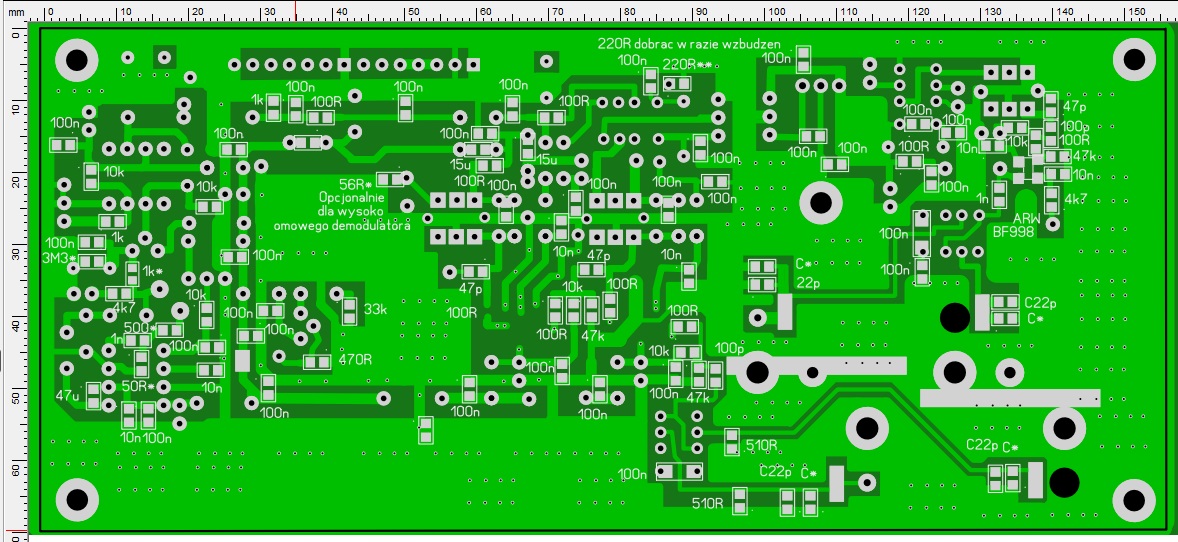 2. Na PCB również z dwoma filtrami kondensator przy MC1350 - jest oznaczony 470 (pF) - to jest wartość zgodnie z oryginałem F6CER, zgodnie z testami bardzo dobrze pracował w tym miejscu 10nF i tak jest na schemacie - można dać 10nF. Na PCB z jednym filtrem w tym miejscu jest wpisana wartość 10nF.