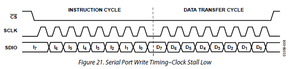 SCLK to wyprowadzenie taktujące naszą szeregową szynę danych pomiędzy atmega i AD9951. W "rytm" zmian tego sygnału wysyłamy polecenia i dane do układu, poprzed wyprowadzenie SDIO, według przepisu podanego poniżej. Poniższy przykład obrazuje jak wysłać do AD9951 jeden bajt, który reprezentuje adres rejestru do którego chcemy zapisać dane, a po nim jeden bajt danych - czyli zawartość tego rejestru.