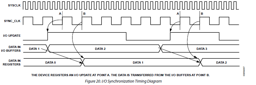 I/O UPDATE to wyprowadzenie, które służy do tego aby wprowadzona przez nas zmiana częstotliwości przyniosła efekt. Jeżeli wyślemy rozkaz zmiany częstotliwości a nie wyślemy impulsu na to wyprowadzenie częstotliwość się nie zmieni.
