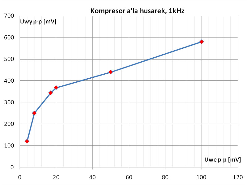 Teraz to co najważniejsze - charakterystyka kompresji. Zmierzyłem od ~4mV do 100mV p-p sygnału wejściowego, f = 1kHz.
