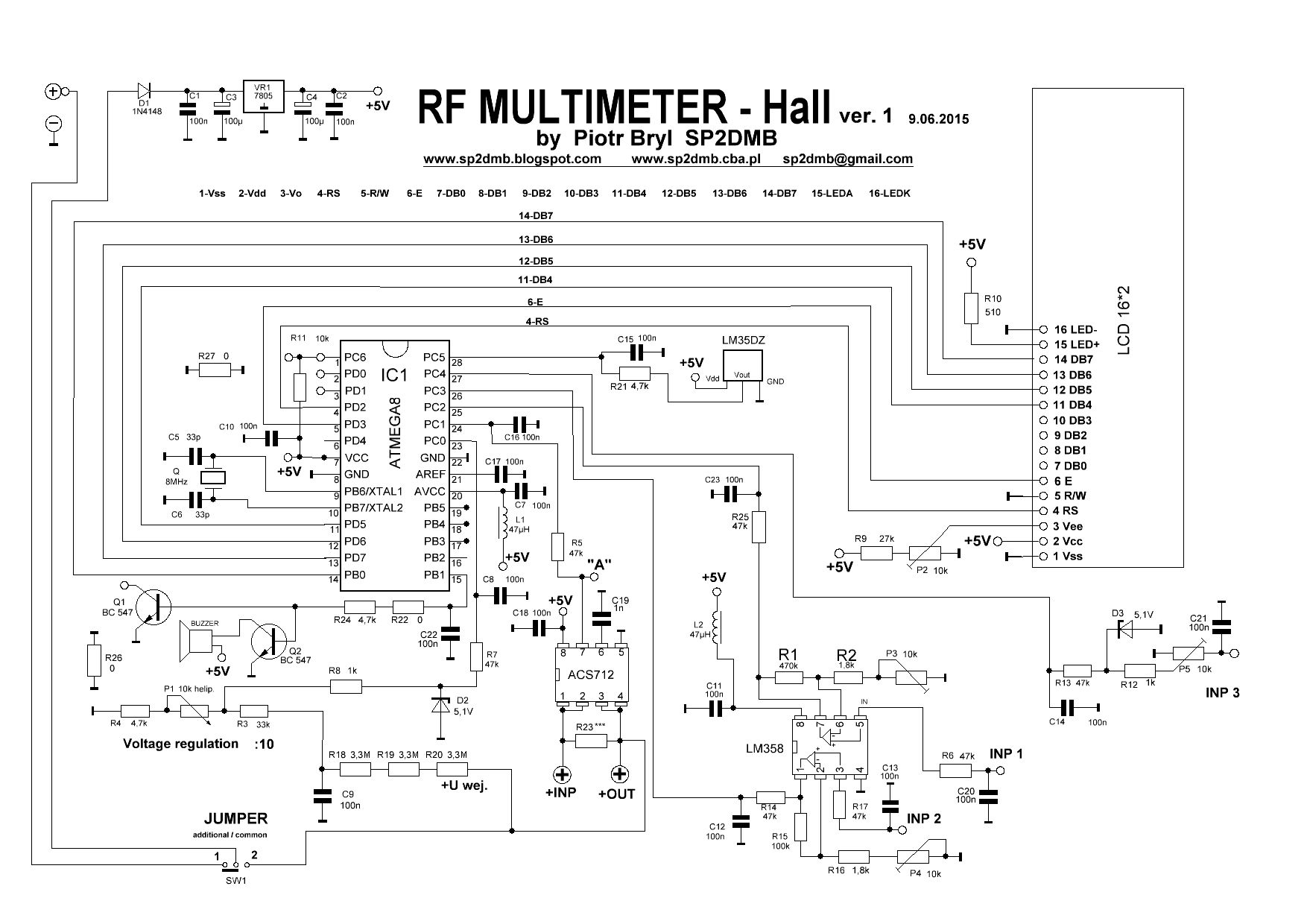 Mam nadzieję, że Piotr SP2DMB nie będzie miał nic przeciwko publikacji schematu multimetru RF i jego zasady działania - schemat jest przecież ogólnodostępny na jego stronie. Do wejścia IN lutujemy gruby przewód zasilający idący z zasilacza poprzez bezpiecznik 15A. Z wyjścia OUT odchodzimy kablem do płytki PA. Jumper SW1 ma być w położeniu jak na schemacie. Po podaniu zasilania potencjometrem P1 na płytce multimetru ustawiamy prawidłową wartość napięcia stałego z zasilacza jaka jest wyświetlana na multimetrze - przedtem trzeba ją pomierzyć innym miernikiem. Sygnał fali padającej podpinamy na złącze INP3, INP2 zwieramy do masy, a do INP1 podpinamy sygnał fali odbitej. Do wyjścia wzmacniacza podłączamy sztuczne obciążenie o stosownej obciążalności. Na płytce PA złącze Bias key PL3 spinamy zworką. Następnie przy załączonym i wysterowanym wzmacniaczu (CW lub głośne aaaaalo) regulujemy P5 tak, aby bargraf na wyświetlaczu mocy wyjściowej multimetru wyświetlał 8 klocków. Można ustawić to również tak, aby wyświetlał więcej, ale wówczas zaczynają nam one zasłaniać wskazania SWR. Pamiętajmy, że do regulacji poziomów fali padającej i odbitej mamy również R6 i R3 na płytce LPF. Po zakończeniu tej czynności przechodzimy do ustawienia wskazań SWR i tym samym ustawienia poziomu zadziałania zabezpieczenia przed jego zbyt wysoką wartością. Multimetr, sam w sobie nie dokonuje pomiaru SWR poprzez porównanie poziomów fali padającej i odbitej, a do określenia SWR używa wyłącznie poziomu fali odbitej w odniesieniu do wartości napięcia stałego ustawionego na drugiej połówce wzmacniacza operacyjnego. Załączamy wzmacniacz i przy jego wysterowaniu sygnałem potencjometrem P4 ustawiamy wskazanie wartości SWR na wyświetlaczu na wartość 1.0 (przy założeniu, że mamy idealne 50 - omowe obciążenie). To koniec czynności regulacyjnych. Czujnik temperatury LM35DZ montujemy na radiatorze stopnia mocy, a jego wyprowadzenia podłączamy do odpowiednich wejść na płytce multimetru. Wyjście tranzystora Q1 podpinamy do wejścia PL3 płytki Protect. Do dalszych prób do wejścia PL2 płytki Protect podłączamy już wyjście napięcia Overdrive protect (złącze PL1 na płytce PA) - czyli zabezpieczenia przed przesterowaniem wzmacniacza sygnałem wejściowym. Na płytce PA zdejmujemy zworkę ze złącza PL3 i podłączamy ją do złącza PL1 na płytce Protect. Potencjometrem R1 ustawiamy próg zabezpieczenia na poziomie mocy wejściowej 8-10W - czyli podniesienie mocy sterującej powyżej tej wartości ma spowodować zadziałanie zabezpieczenia i poprzez załączone styki przekaźnika przełączenie sygnału wejściowego na sztuczne obciążenie (równoległe rezystory R2 i R3 na płytce PA). Zadziałanie układu Overdrive protect jest sygnalizowane zapaleniem się czerwonej diody na płycie czołowej. Jeżeli do płytki Protect dochodzą poziomy zabezpieczenia idące z układu multimetru RF (wysoki SWR lub temperatura) zapala się czerwona dioda, piszczy buzzer, a na wyświetlaczu migają napisy ostrzegawcze (HIGH SWR, HIGH TEMP, CHECK YOUR RIG). Puszczamy PTT i nie pozostaje nam nic innego jak szukać przyczyny zadziałania układu Protect.