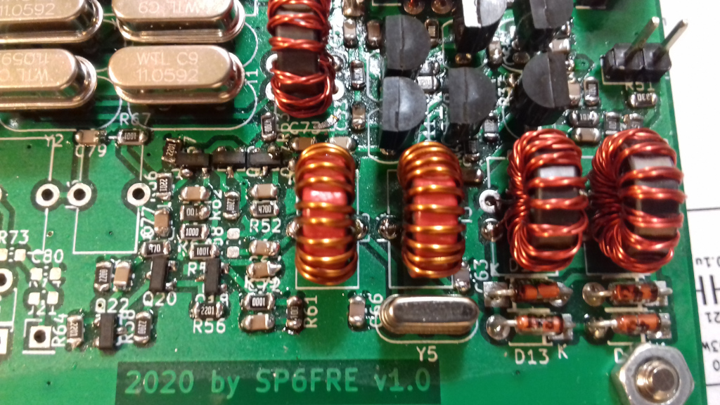 Wykonany tor wzmacniacza pierwszej pośredniej, z tranzystorami smd, wydawał się być najtrudniejszy do montażu z dwóch powodów. Ma największą gęstość ułożenia elementów oraz zawiera niewielki błąd projektowy, który zauważyłem dopiero podczas montażu. Podczas kojarzenia obudowy do tranzystora smd BFR92, zaufałem automatycznemu doborowi przez program Kickad i okazało się, że albo zakupiłem za 'duże' tranzystory albo dopasowany footprint jest nieco za mały. Niemniej udaje się, prawie bez problemów, wlutować tranzystory i pozostałe elementy trzymając się jak zwykle zasady, że montaż należy zaczynać od najmniejszych elementów (tranzystorów) a kończyć na elementach największych. elementach przewlekanych, transformatorach i cewkach.