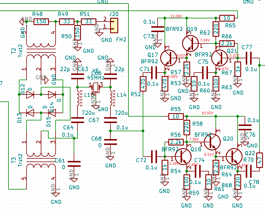 Ponieważ napięcia na tranzystorach wzmacniaczy nadajnika i odbiornika są zbliżone i wydają się zgadzać z oczekiwaniami i wartościami dla wykonanego już stopnia dla drugiej pośredniej to nie testowałem wzmacniacza. W odbiorniku działają tranzystory QQ21, Q19 i Q17 a w nadajniku Q18, Q20 i Q22. Pomiar napięć wzmacniacza nadajnika można zrobić jak poprzednio, przełączając układ w stan nadawania za pomocą opornika co najmniej 1k dołączonego od zacisku T/R do napięcia +12V.