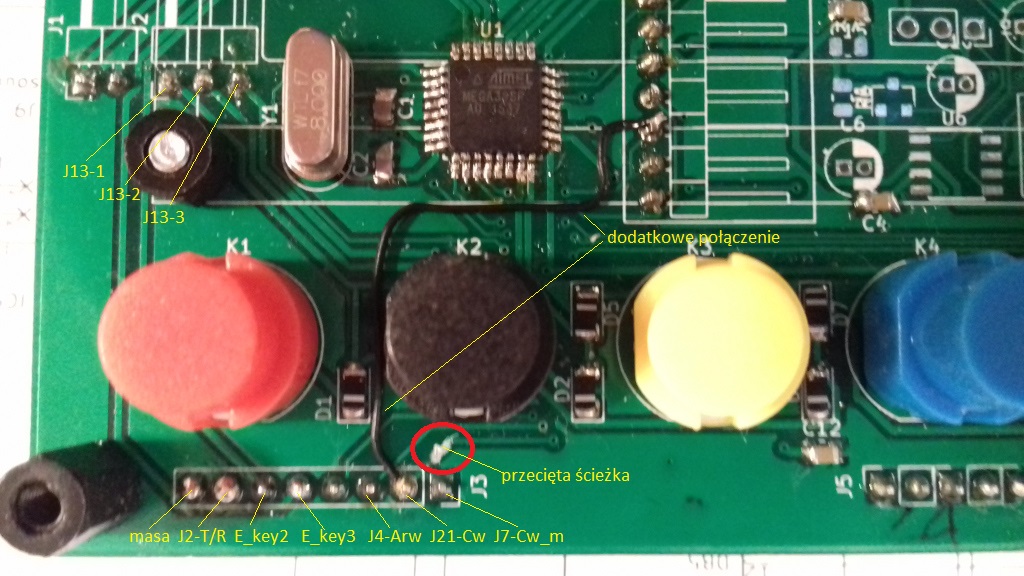 Niestety, po raz kolejny, ale mam nadzieję ostatni, należy wykonać drobną modyfikację płytki sterownika. Zabrakło mi wyjścia do kluczowania cw dlatego musiałem zabrać nieużywane teraz wyjście PB0 z obwodu generatora (i tak było nie podłączone ze względu na modyfikację płytki SI5351 -> patrz post #123).
