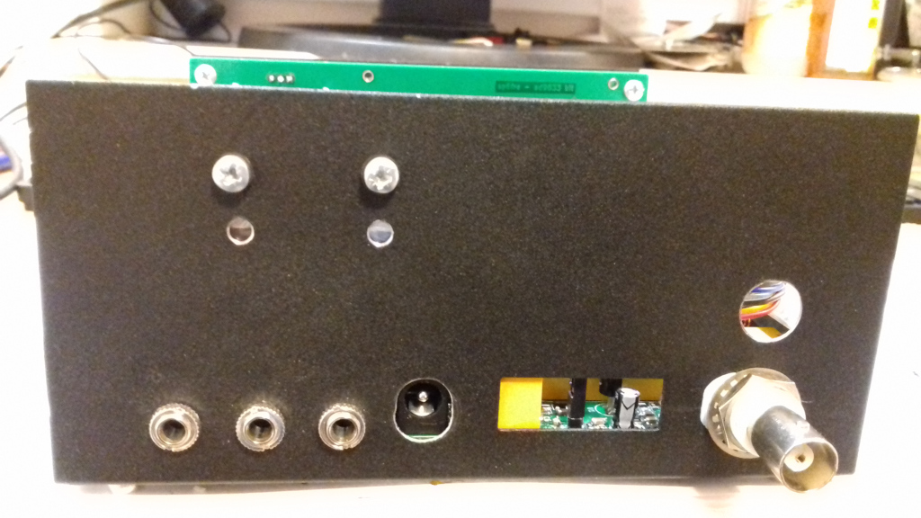 Na zdjęciach pokazałem wygląd urządzenia w obudowie z okablowaniem poza podłączeniem płytki nadajnika. Płytkę nadajnika musiałem podnieść na tulejkach o 10mm bo z trudem mieściły się pod nią wtyki połączeń kablowych płytki głównej. Ale jeśli zastosuje się zamiast połączeń rozłączalnych połączenia lutowane to będzie wystarczająco dużo miejsca aby kable zmieściły się pod nadajnikiem.