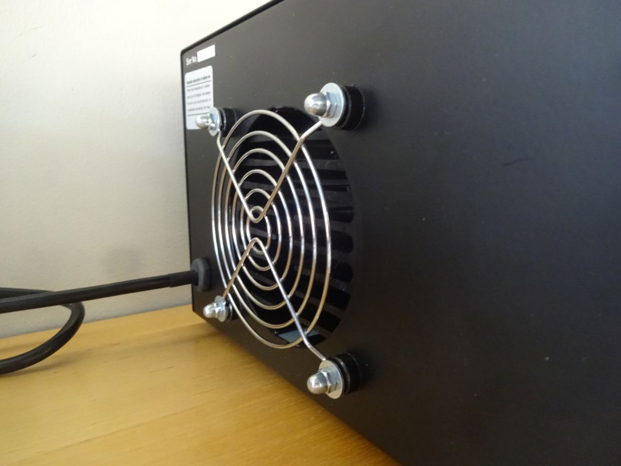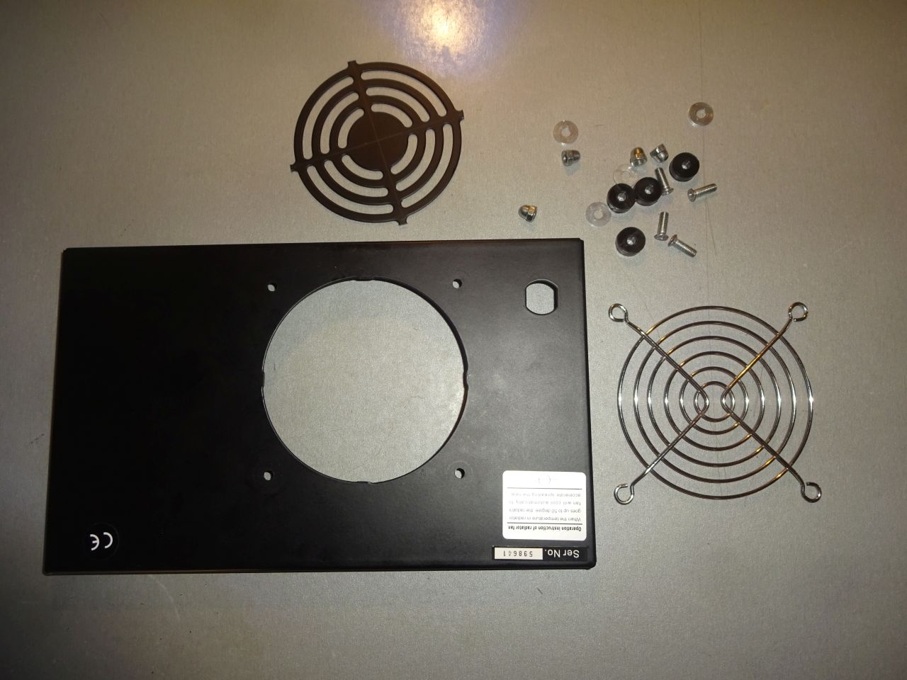 Po demontażu tylnej ścianki zasilacza (musiałem odciąć wtyczkę sieciową lub trzeba odlutować kabel zasilający w zasilaczu) wyciąłem maskownicę wentylacyjną wykonaną w niej przez producenta. Użyłem piłki włosowej. Zamiennie na tulejach dystansowy (wysokość 5mm, fi12) przykręciłem typową drucianą kratkę pasującą rozmiarem do zastosowanego wentylatora (92x92mm). Zastosowałem śruby M4 ze stożkowymi łbami oraz możliwie głęboko fazowane otwory po wewnętrznej stronie (niestety blacha obudowy jest dosyć cienka). Łby śrub też zostały przeszlifowane (okazało się później, że niepotrzebnie..), żeby zbyt nie wystawały ponieważ planowałem naklejenie od wewnętrznej strony filcowej uszczelki uszczelniającej wylot (wokół otworu wentylacyjnego). Na razie pomysł ten odłożyłem z powodu nieprecyzyjnego złożenia bloku radiatorów, który miejscami zbyt dużo odstaje od tej ścianki (jego powierzchnia czołowa nie jest do niej równoległa, tylko miejscami do niej przylega).