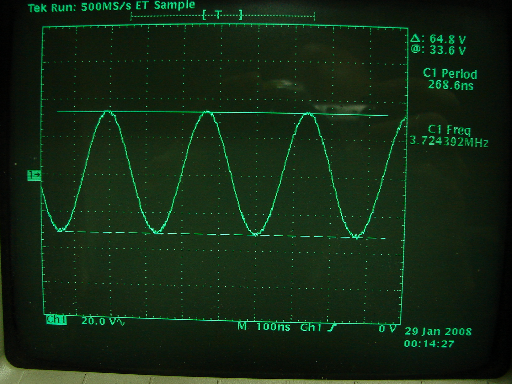 Aby obliczyć moc zgodnie z tym co napisałem wcześniej odczytujemy z oscyloskopu wartość międzyszczytową, która wynosi 64,8V. Do naszego prostego wzoru potrzebna jest wartość szytowa, więc odczytany wynik dzielimy przez dwa co daje 32,4V. Tą wartość podnosimy do kwadratu czyli jest 1049,76 i na koniec przesuwamy przecinek o dwa miejsca w lewo i dostajemy ostateczny wynik pomiaru mocy naszego wzmacniacza czyli w zaokrągleniu 10,5 Wata. Mój oscyloskop sam mierzy wartość szczytową i podaje gotowy wynik, jednak ten wynik jest obarczony pewnym błędem, bo oscyloskop jes czuły na wszelkie zakłócenia, których w miejscu pomiaru nie brakowało i wynik mógłby być lekko zawyżony. Pomiar za pomocą ręcznie przesuwanych znaczników uważam za najlepszy w sytuacji istnienia zakłóceń.