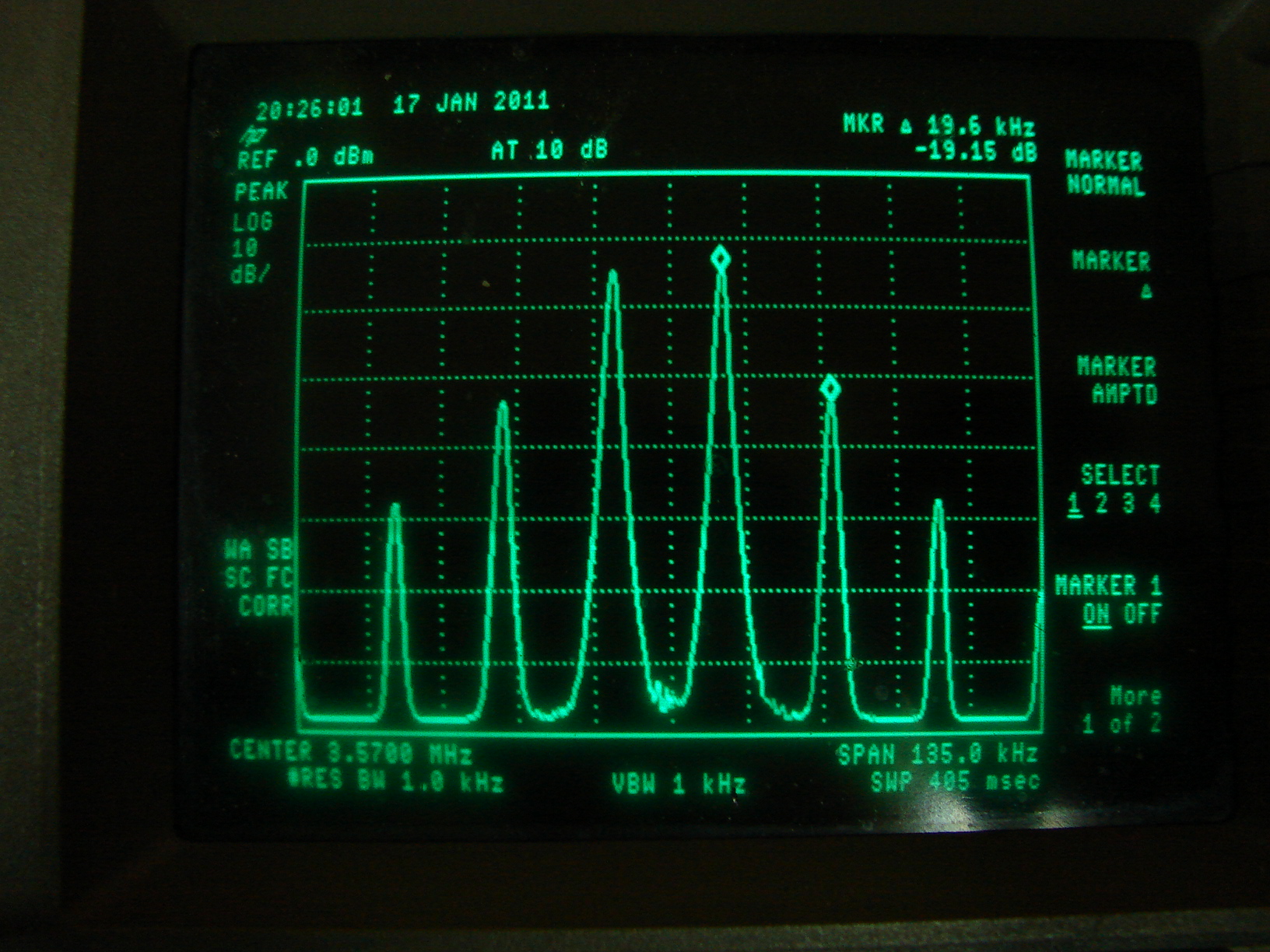 Do odczytu wyników pomiarów używam analizatora widma, ale ci którzy nie mają takiego przyrządu mogą posłużyć się odbiornikiem KF z S-metrem. Wymagania na ten odbiornik nie są szczególnie wysokie. Dla profesjonalnych wzmacniaczy mocy wartość intermodulacji ( odstęp prążków podstawowych od prążków trzeciego rzędu) wynosi najczęsciej tylko nieco powyżej 40dB, rzadziej powyżej 45dB. Dla sprzętów amatorskich jak uzyskamy dla QRP około 20dB, a dla większych mocy około 25-30dB możeemy być zadfowoleni. Dla QRO należy dążyć do wartości 40dB. Nie ma z tym problemu we wzmacniaczach lampowych, ale w tranzystorowych trzeba mocno się napocić, żeby to uzyskać.