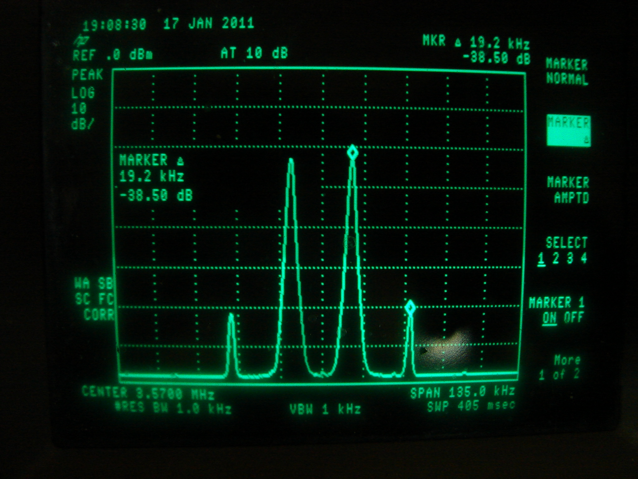 Oto wynik pomiaru intermodulacji dla sygnału dwutonowego: