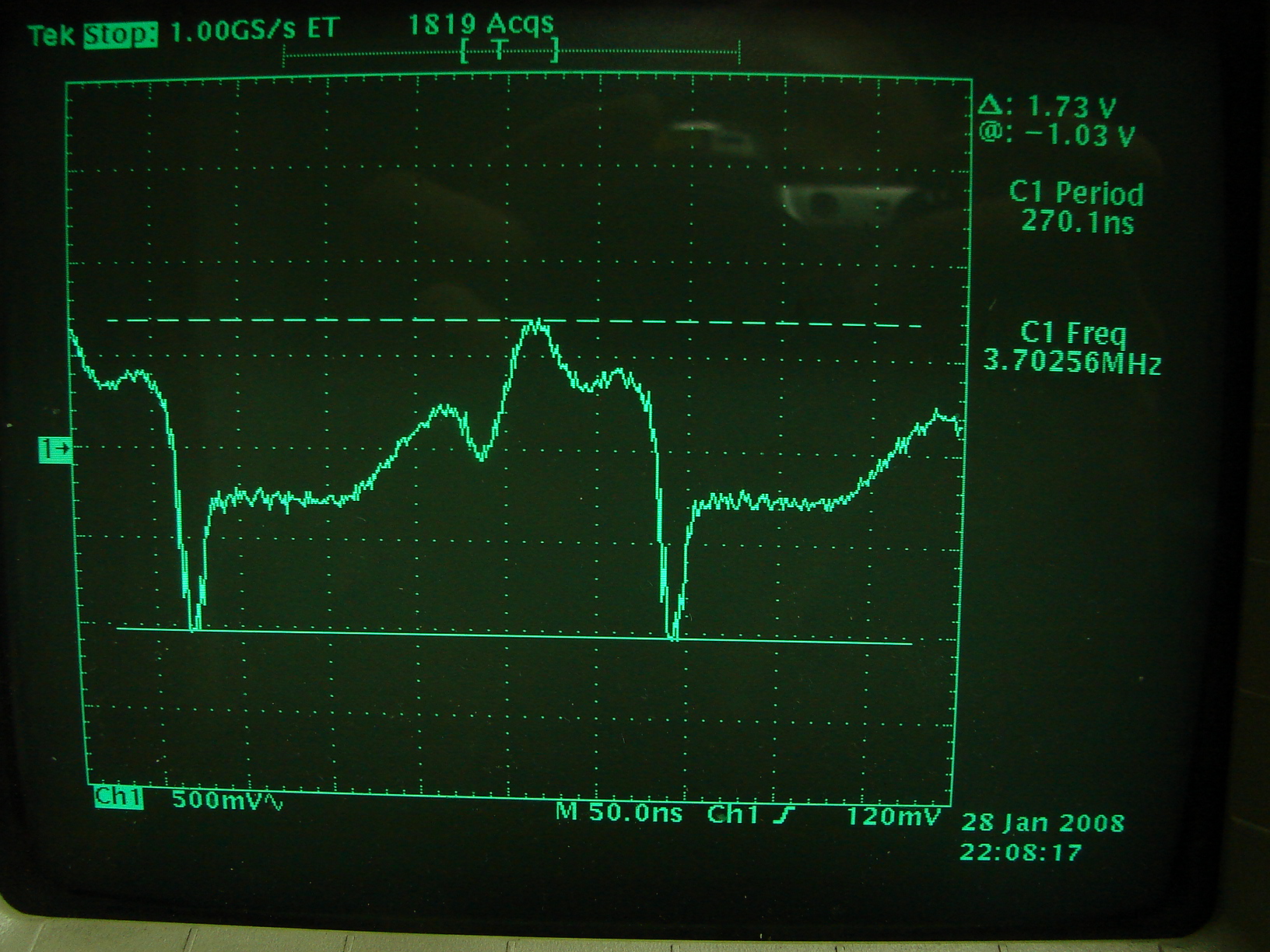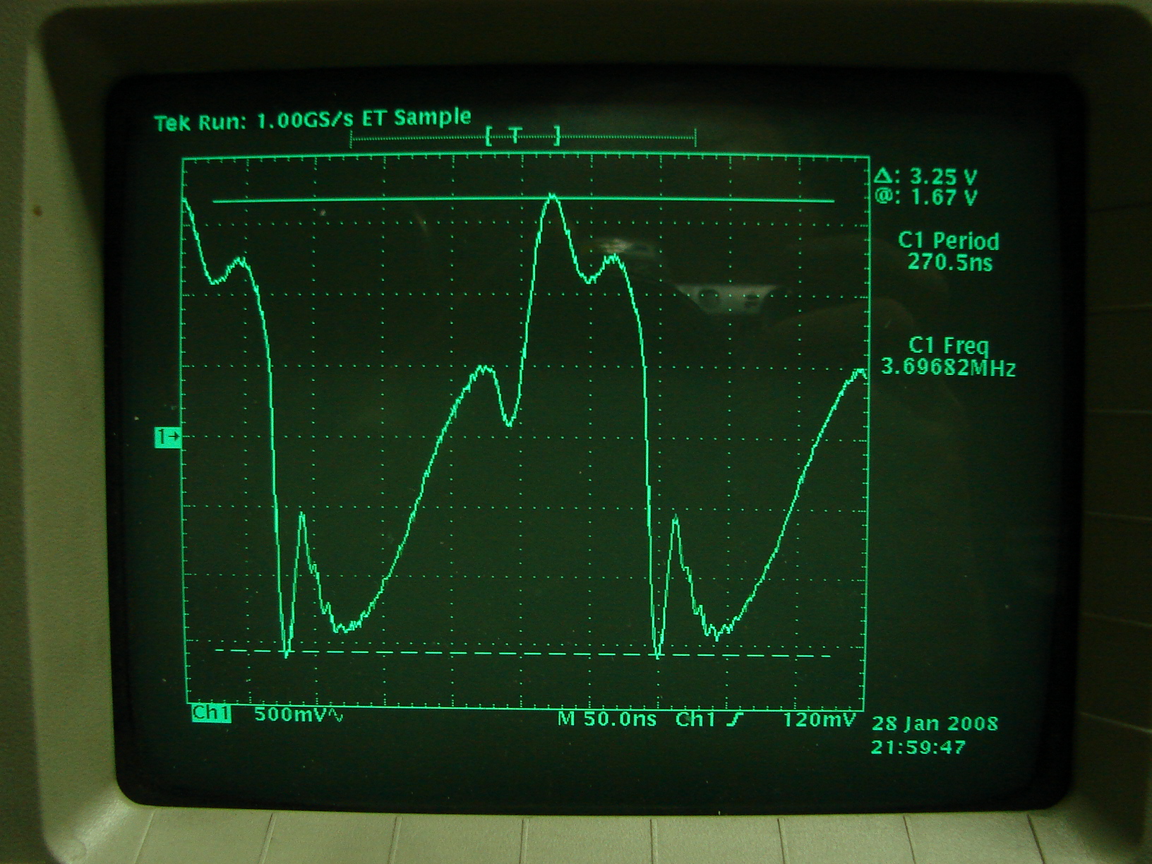 Przy mniejszej mocy przebieg sterujący bramkę mosfeta jest już bardziej do czegoś podobny: