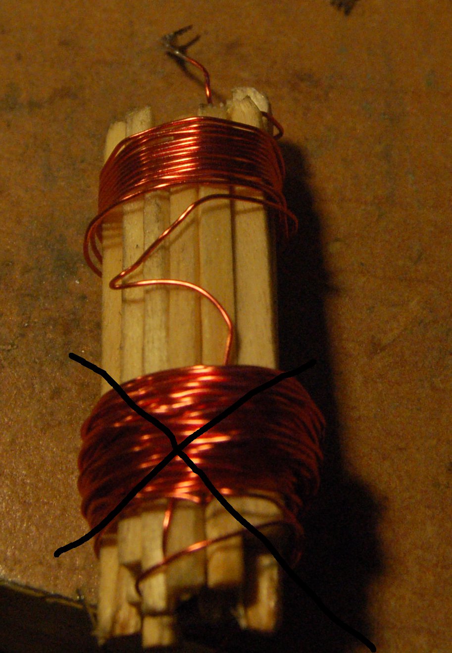 Skreślony element (nawinięty drut) nie brał udziału w rezonansie (był odwinięty), potem go w celu magazynowym nawinąłem i do zdjęcia już nie chciałem odwijać.