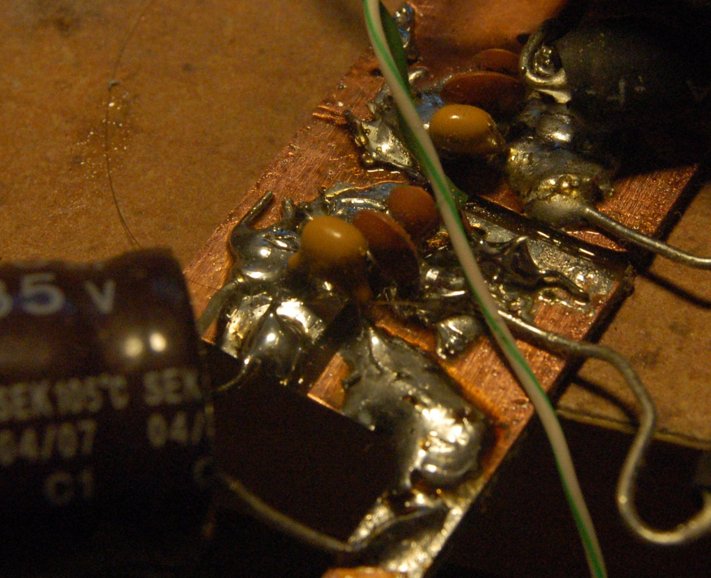 Na zdjęciu zdj5 dokładniej widać prawy górny róg kond2.jpg, tj. pionowe 10n w prawym górnym rogu, a następnie od góry: 10n, 100n, 100n, 100n i po lewej pionowo 100n z pi filtra wyjście.