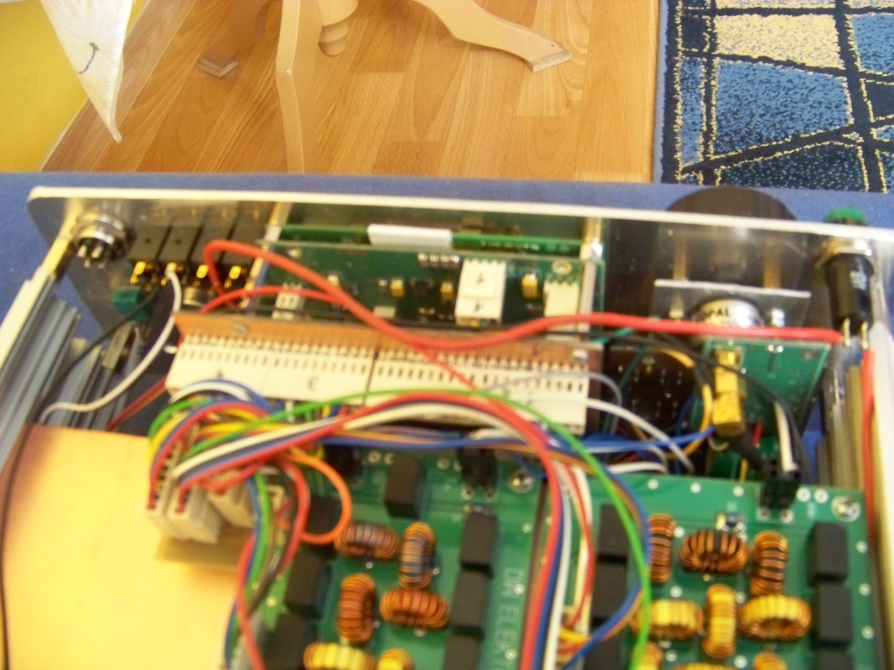 Płytkę rejestrów musiałem zamocować ,,do góry nogami" i do tego odjąć ok. 1 cm. z wysokości pola masowego (obciąć). W innym wypadku wystawała zbyt mocno i nie dałoby się z jednej strony założyć pokrywy. Spowodowane to było faktem nabycia przeze mnie płyty czołowej z niżej osadzonym oknem wyświetlacza i stąd opisane zabiegi. Na koniec garstka nowych fotek. Porządek z kablami (wiązki) będzie zrobiony po kompletnym połączeniu modułów. Na tylnej płycie brak gniazda CAT. Mam nadzieję, że kiedyś (oby jak najszybciej) będzie taka potrzeba, aby je wstawić, hi.