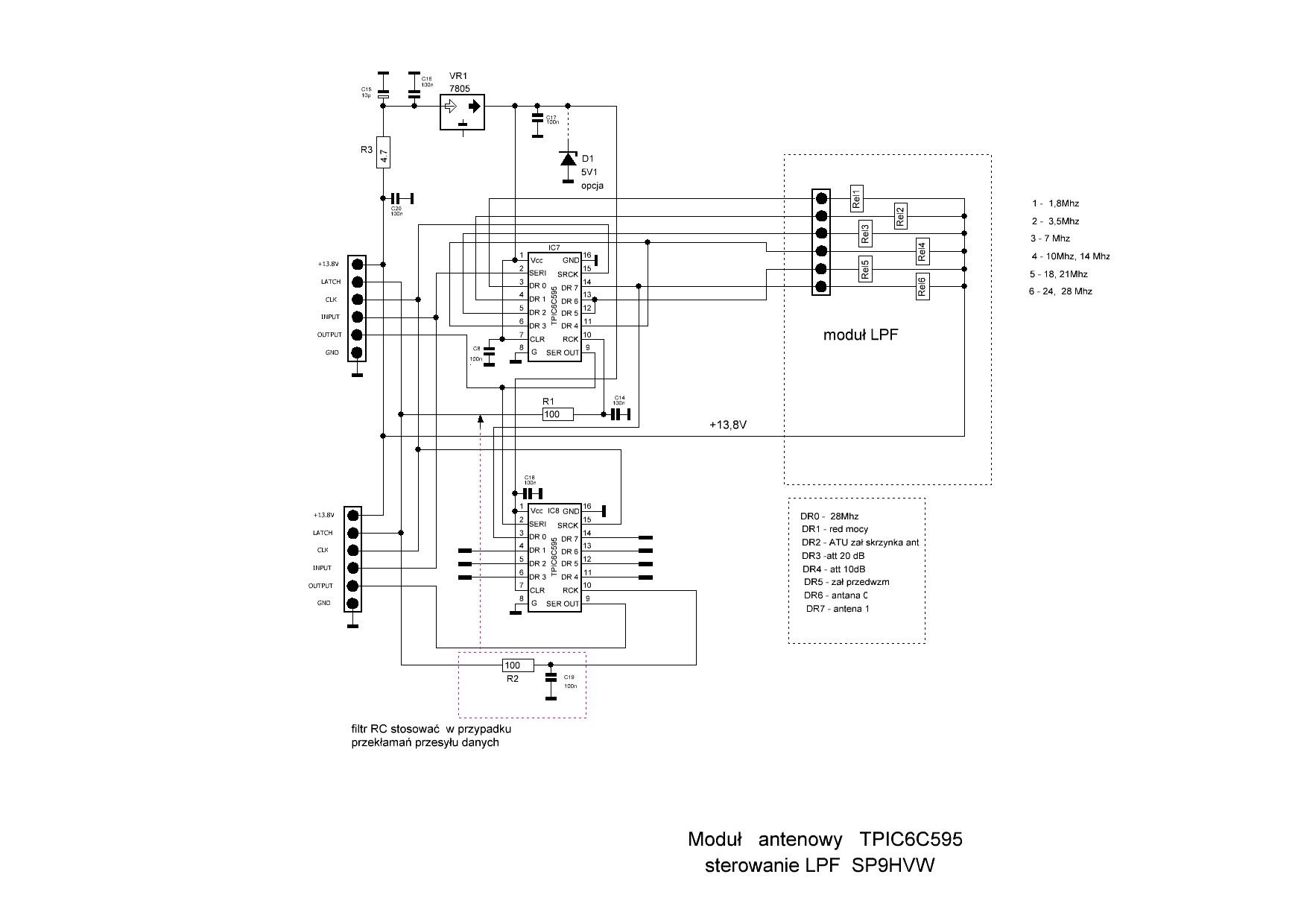 Mam też gotowy moduł LPFów jako oddzielny moduł mieszczący się w profilu ceownika 100x38 i przykręcany na kanapkę do wzmacniacza, jak zmontuje to zamieszczę zdjęcie. W module LPF jest postawiona płytka PCB z rejestrami do sterowania LPF na układach TPIC6C595 piny tych układów nie sa zgodne z pinologią HC595.