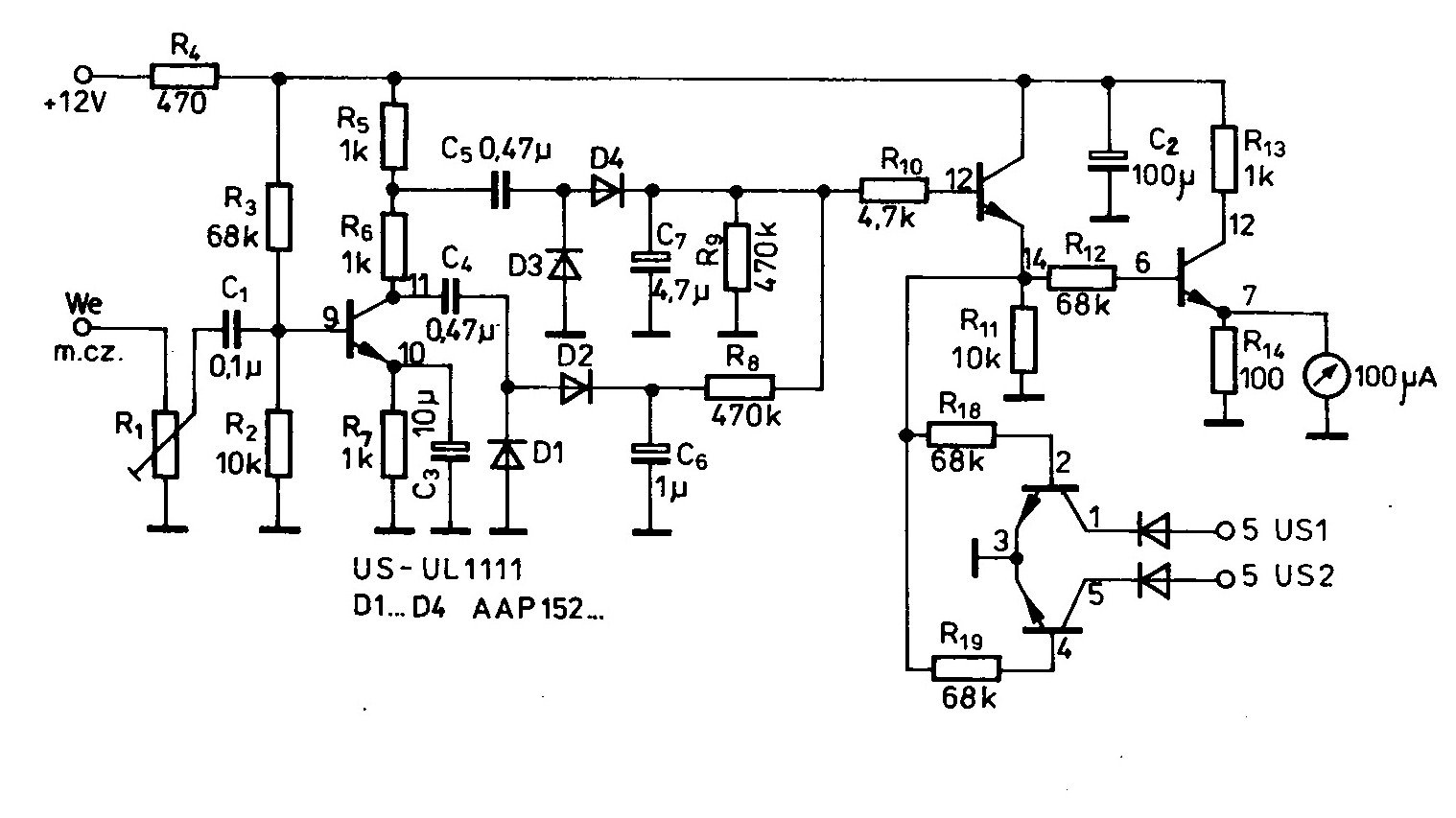 Poza tym, w miejscu połączenia D4 oraz C7 napięcie bez sygnału m.cz. powinno mieć wartość 0V. Po podaniu sygnału m.cz. na wejście, w tym miejscu (D4-C7) powinno pojawić się napięcie dodatnie, tym większe im większy sygnał podasz. Gdy napięcie to osiągnie ok. 1.3V powinien poruszyć się miernik S i powinno zacząć działać ARW. Jak prowizorycznie dołączysz kolektory (pin 1 i 5) do 12V przez oporniki 4.7K to w tym momencie powinieneś zaobserwować spadek napięcia na kolektorach z 12V do zera.