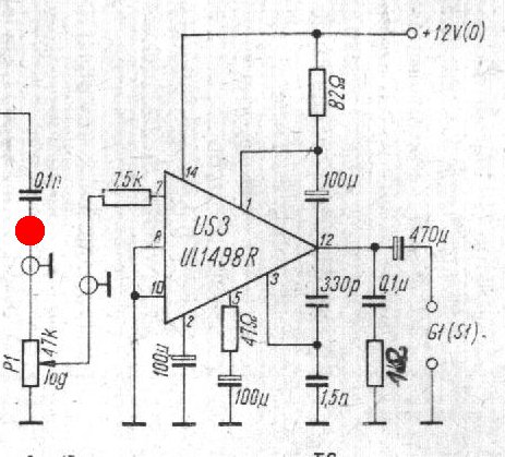 Przy takim ustawieniu (wejście połączone z wyjściem głośnikowym) nóżki 5 US1 i US2 nie są podłączone - gdy to zrobiłem, pojawiało się wzbudzenie ("tykanie").
