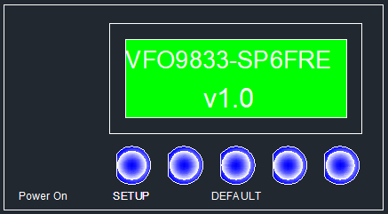 Trzymając środkowy klawisz podczas włączenia zasilania ustawia się wartości domyślne a więc 2 pasma, częstotliwość początkową 3.5MHz oraz częstotliwość pośrednią Fmid=0MHz. Potwierdzeniem tego jest napis na wyświetlaczu "Loading default". Te ustawienia, jak i inne w sekcji SETUP są zachowane w pamięci nieulotnej procesora i odczytywane z niej podczas każdego kolejnego startu