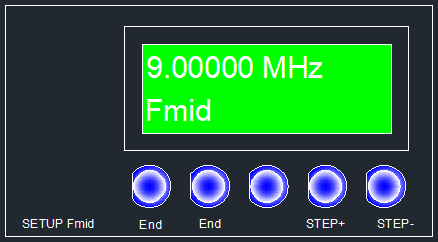 Domyślenie, częstotliwość pośrednia ma wartość 0MHz co oznacza, że na wyjściu jest taka sama częstotliwość jak na wyświetlaczu. Zmianę częstotliwości pośredniej dokonuje się z pomocą impulsatora z krokiem ustawianym za pomocą obu prawych klawiszy z krokiem 10Hz, 100Hz, 1kHz, 10kHz, 100kHz i 1MHz. Jest to możliwe także za pomocą impulsatora po wciśnięciu przełącznika osiowego. Przejście w tryb ustawiania kroku za pomocą impulsatora sygnalizowane jest zapaleniem się diody na czerwono a przejście do ustawiania częstotliwości wymaga ponownego użycia przycisku osiowego impulsatora a kolor diody zmienia się na zielony.