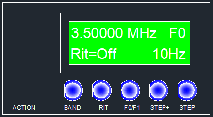 W trybie normalnej pracy lewy klawisz zmienia pasmo, kolejny klawisz włącza lub wyłącza RIT (po włączeniu Rit-a krok przestrajania automatycznie ustawia się na 10Hz), klawisz środkowy przełącza system pomiędzy częstotliwościami F0 i F1 (dwukrotne użycie tego przycisku zrównuje F0 i F1) a prawe klawisze służą do zmiany kroku przestrajania. Przestrajanie i zmianę kroku zapewnia impulsator co opisałem powyżej.
