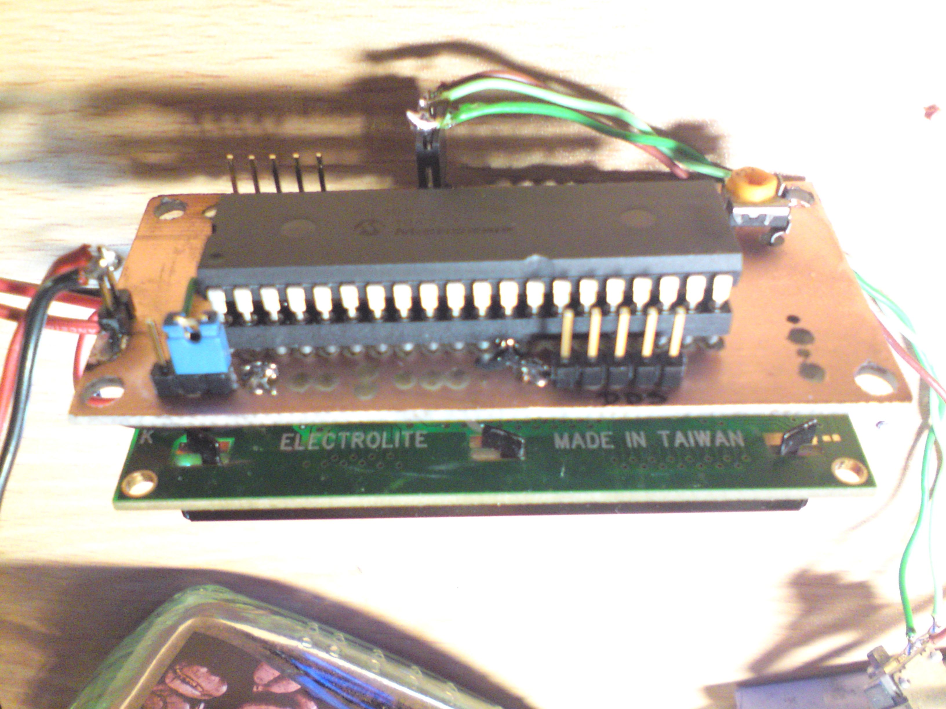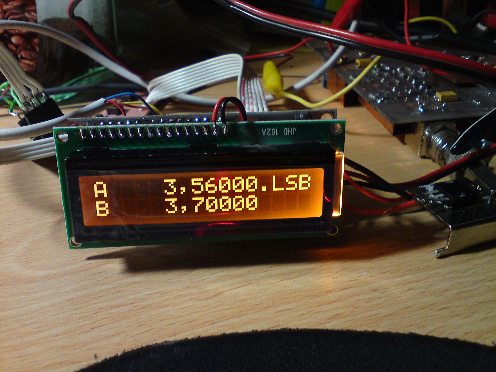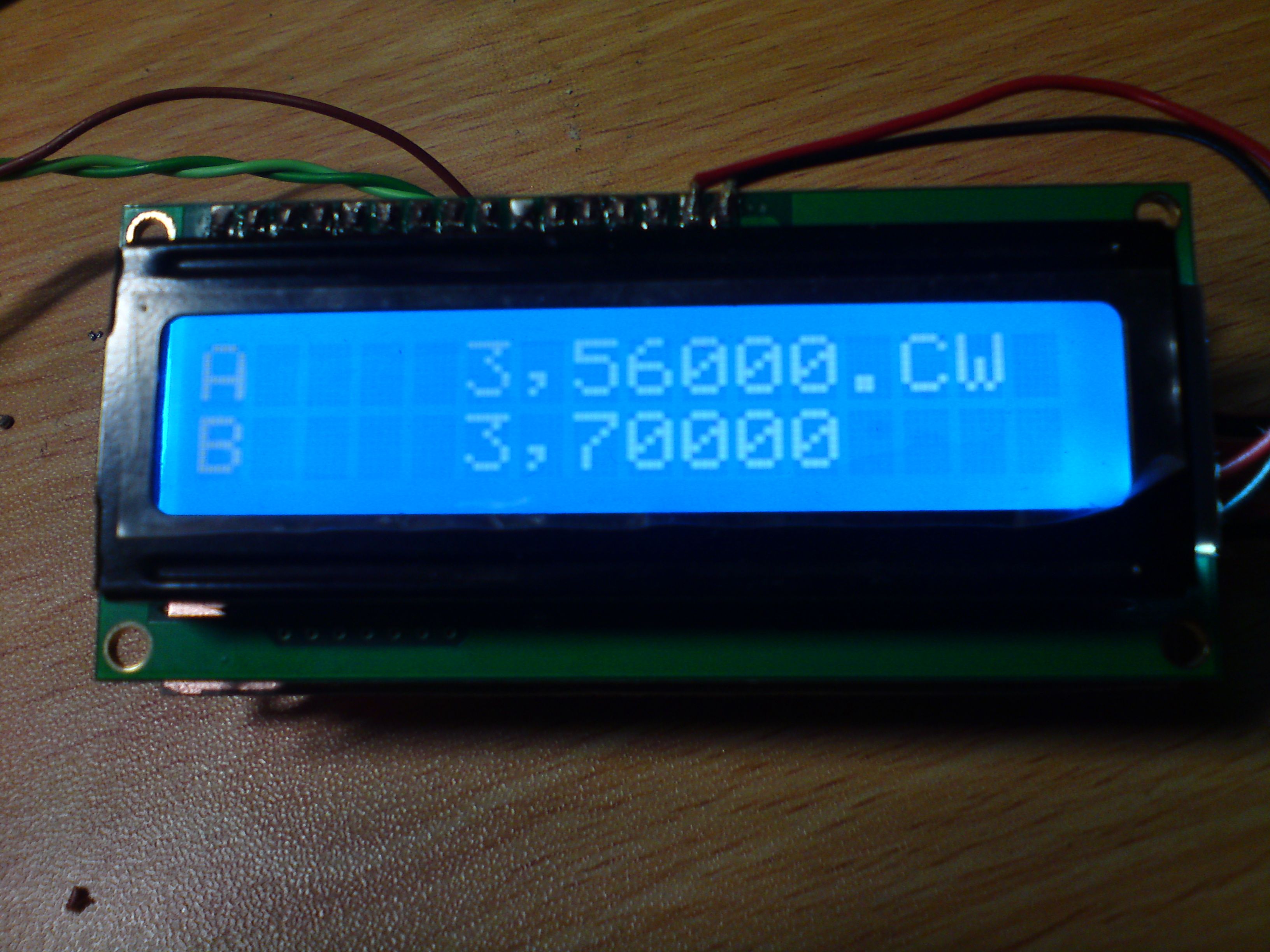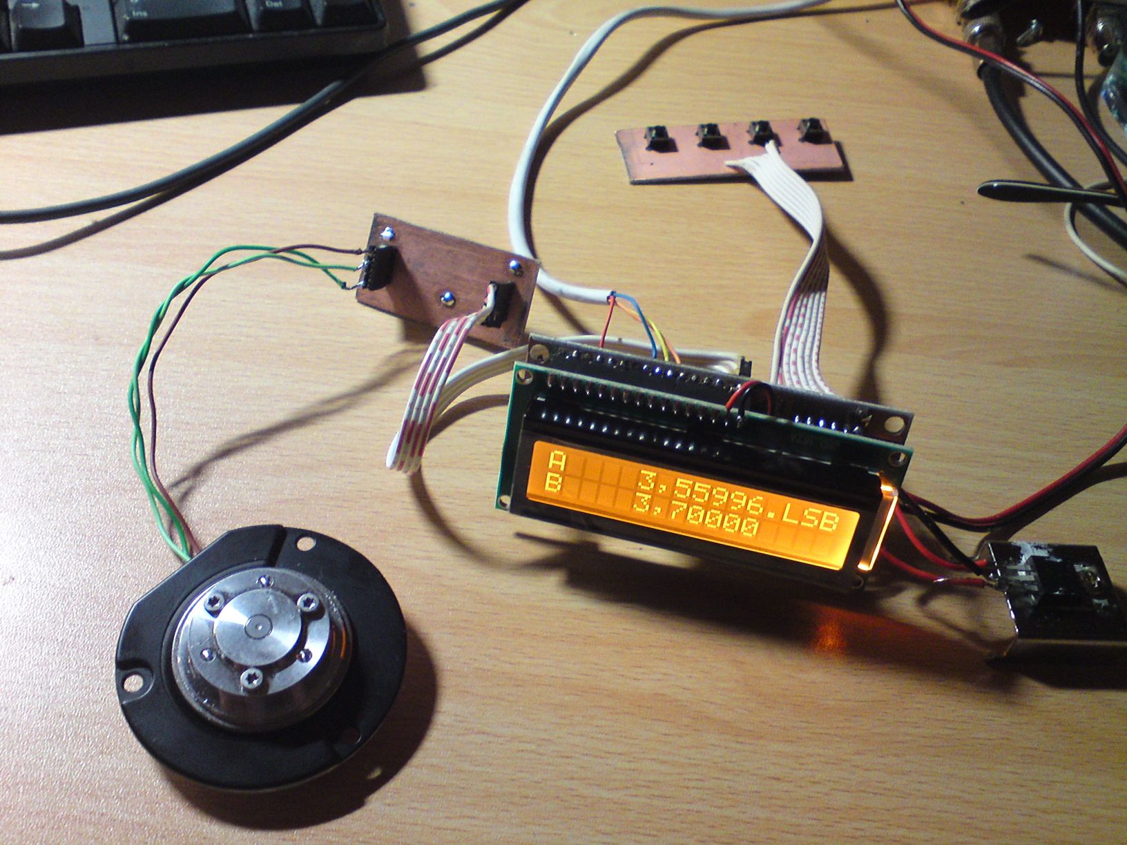 W załączniku moje wykonanie sterownika. Najpierw użyłem wyświetlacza niebieskiego z białymi znakami, ale przy przestrajaniu ostatnia cyfra dość mocno się rozmywała (wolny transfer danych chyba). Dzisiaj przyszedł nowy wyświetlacz i znaki zmieniają się bardzo wyraźnie, bez smużenia. Na kolejnym zdjęciu całość, z szybko wykonaną płytką klawiatury do testów oraz silnikiem HDD jako impulsatorem (plus płytka ze wzmacniaczem operacyjnym formującym impulsy).