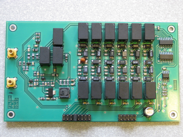 Firma DW-Electronics po udanym produkcie płytki Piligrima SMD postanowiła rozszerzyć asortyment o płytkę BPF, którą otrzymałem do testów. Są 6 pasmowe, 5 polowe , oktawowe filtry zbudowane na elementach smd. Przy wymiarach płytki 73 x 127 mm. Znalazło się miejsce na deszyfrator CD4028, bufor ULN2003, jak i wzmacniacz na BFG591 wzmacniający 10-12 dB. Wzmacniacz pełni dwojaką funkcję: może być załączany przy odbiorze, jak i może wzmacniać sygnał po mieszaczu nadajnika. Filtry te posiadają tłumienie sygnału 3 harmonicznej na poziomie -60dB. Taka wartość jest niezbędna do zastosowania w homodynie, która ma taką „przypadłość” , że odbiera poza częstotliwością podstawową również nieparzyste harmoniczne. Np. 3- harmoniczną odbiera tylko 10dB gorzej od podstawowej. W załączeniu przedstawiam część wykonanych pomiarów. Pdf 1_7 pokazuje wielkość przenikania sygnału po masie pomiędzy wejściem a wyjściem bez załączenia żadnego filtru. Moja sugestia jest taka, aby zrezygnować z zazębiania się pasm w celu pokrycia całego KF a skupić się na przesunięciu 1_1 jak i 1_2 w dół aby uzyskać jak najmniejsze tłumienie w pasmach amatorskich.