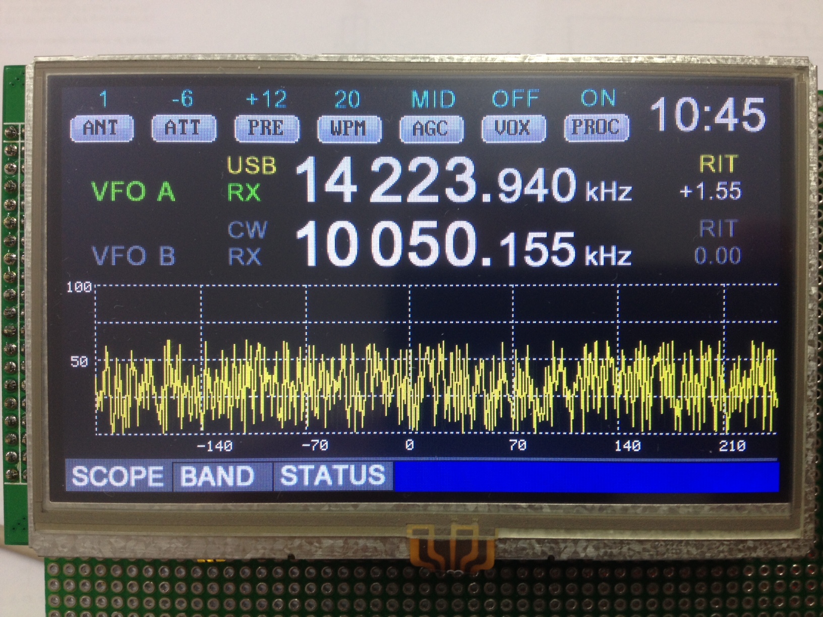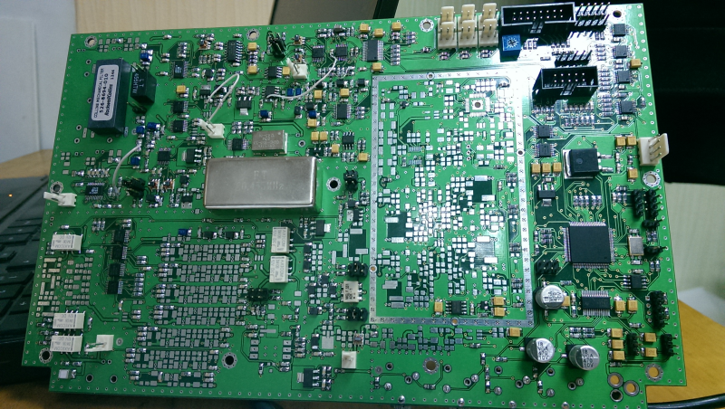 Tests now performed on real transceiver (small-signal path onlyl) board. Larger photo in a same topic - http://www.cqham.ru/forum/showthread.php...post988727 . Only one processor STM32F429 @180 MHz is used for DSP TX/RX functions at 48 kHz sample rate and for all TRX control functions. Only basic functionality - variable DSP filters and NOTCH implemented now. Same as FM/AM/SSB modulation/demodulation.