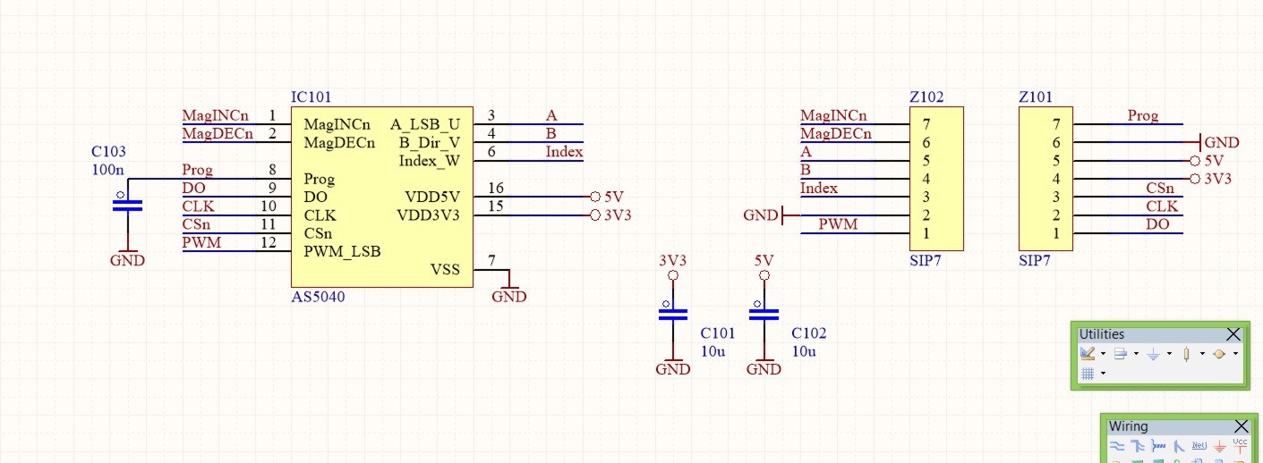 Wojtek: schemat to zwykła aplikacja układu AS5040 + 2 kondensatory blokujące na zasilaniu. Wyjście z końcówek A B układu w miejsce enkodera na UI, masa i 5V.