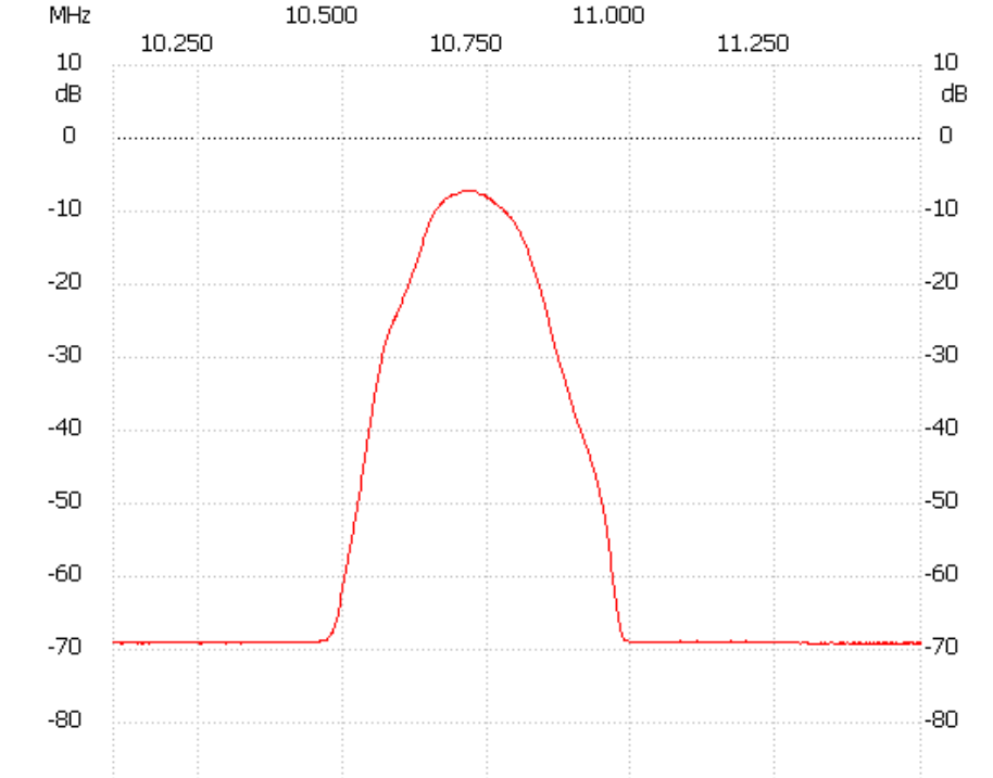 Waldku jestem osioł ;-), napisałem Ci na płytce tak z pamięci FCM 10,7 bo niby co, filtr z radia, każdy 330 omowy i szeroki FM, jedna i ta sama rzecz. Ja u siebie filtry stosowałem z demontażu + to co brałem w Maritexie. Jednak nowsze filtry są znacznie lepsze, na 2 rysunkach filtry moje 10,7MHz szerokie, jeden pomierzyłem w swym analizatorze, 2 dzisiaj szybko zlutowałem (żaden nie jest oczywiście FCM 10,7 MHz a nowszy pewnie chiński ;-)). Wartości elementów podane przeze mnie, bez modyfikacji. Tłumienie lepsze w paśmie przepustowym i zaporowym. Jeden wniosek możemy w swoich starych radiach prosto i niskim kosztem poprawić parametry. Co do filtru kwarcowego pomiędzy blokami są małe pojemności do masy i mają one wpływ na te zafalowanie z 2 strony.