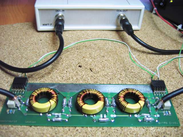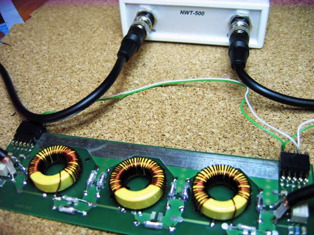 Ponieważ nie chciało mi się nawijać cewek TOKO, żeby powtórzyć pomiary, to polutowałem szybko filtr PA3AKE - jako, że wartości elementów BPF dla 80m są prawie identyczne jak w PIC-a-STAR, a toroidy nawinięte leżały już od jakiegoś czasu... Podpiąłem do mojego egzemplarza NWT-7: