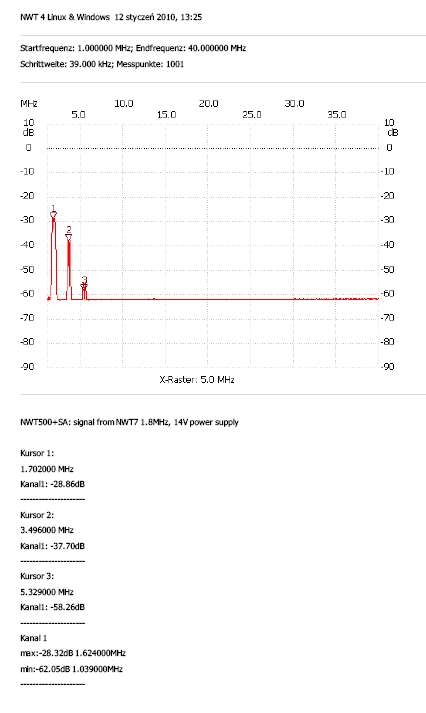 Wygląda nieźle... Zacząłem szukać i już po godzinie Wink znalazłem: głównym winowajcą okazał się... kiepski kabel łączący mierzony układ z sondą w NWT-500 (kabel podający sygnał był OK). Dodatkowo w trakcie poszukiwań zmieniłem nieco miejsce dołączenia masy do mierzonego układu oraz poprawiłem połączenia masy z obudową w NWT-500, co również miało wpływ na szumy, ale niezbyt duży.