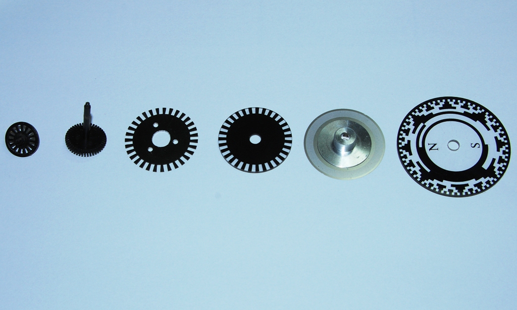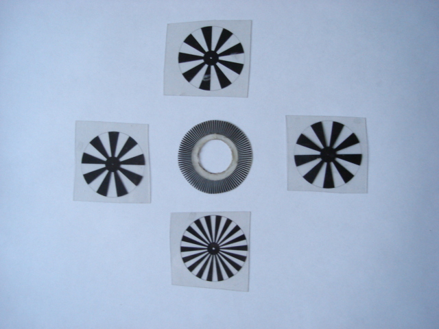 Na kolejnym zdjęciu kilka wykonań tarcz do enkoderów optycznych ( z myszy, frezowana, wykonana sitem, profesjonalna trawiona, z przetwornika kąta).