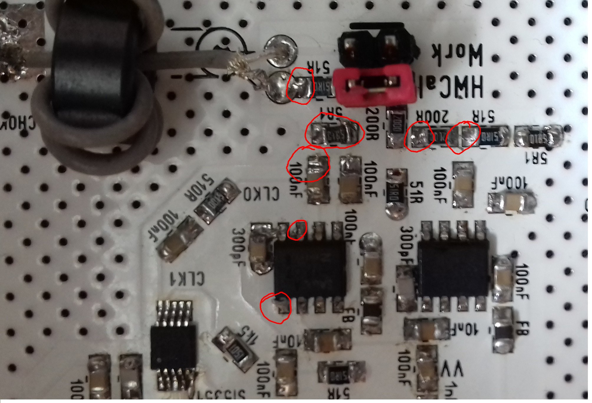 Sprawdź, czy nie masz uszkodzonego koncentryka w miejscu lutowania ekranu do masy PCB . Jak za długo grzałeś, mógł się wytopić dielektryk między ekranem a żyłą środkową i zrobiło się tam zwarcie.... Choć, przy założonej zworce HwCal i zdjętej Work, nie powinno mieć znaczenia.