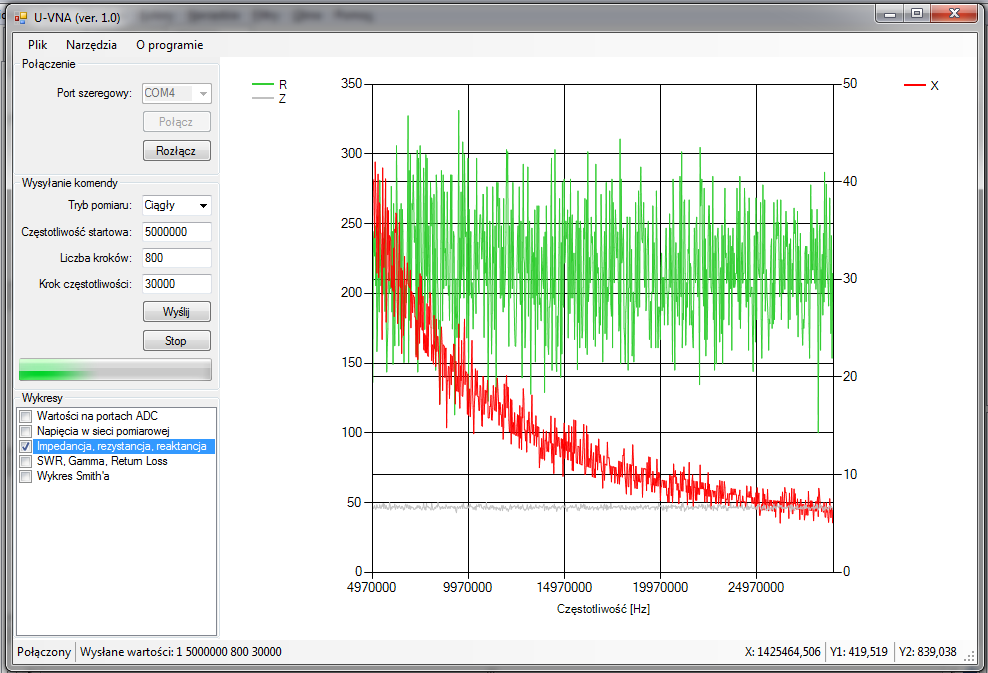 Wartość "|Z|" (mierzona napięciami, a nie obliczona z R i X) całkiem dobra - nieco poniżej 50R w całym zakresie.