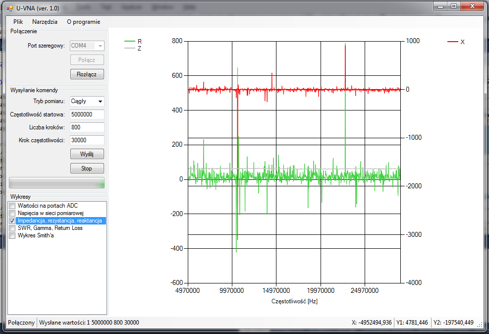 Wartość "X" jest w miarę OK i spadek z 40 omów dla niskich częstotliwości do ok. 5 omów dla wysokich można tłumaczyć pojemnością tego mierzonego terminatora (taki zwykły BNC za parę złotych). No tylko znak się nie zgadza - może jeszcze błąd w obliczeniach.