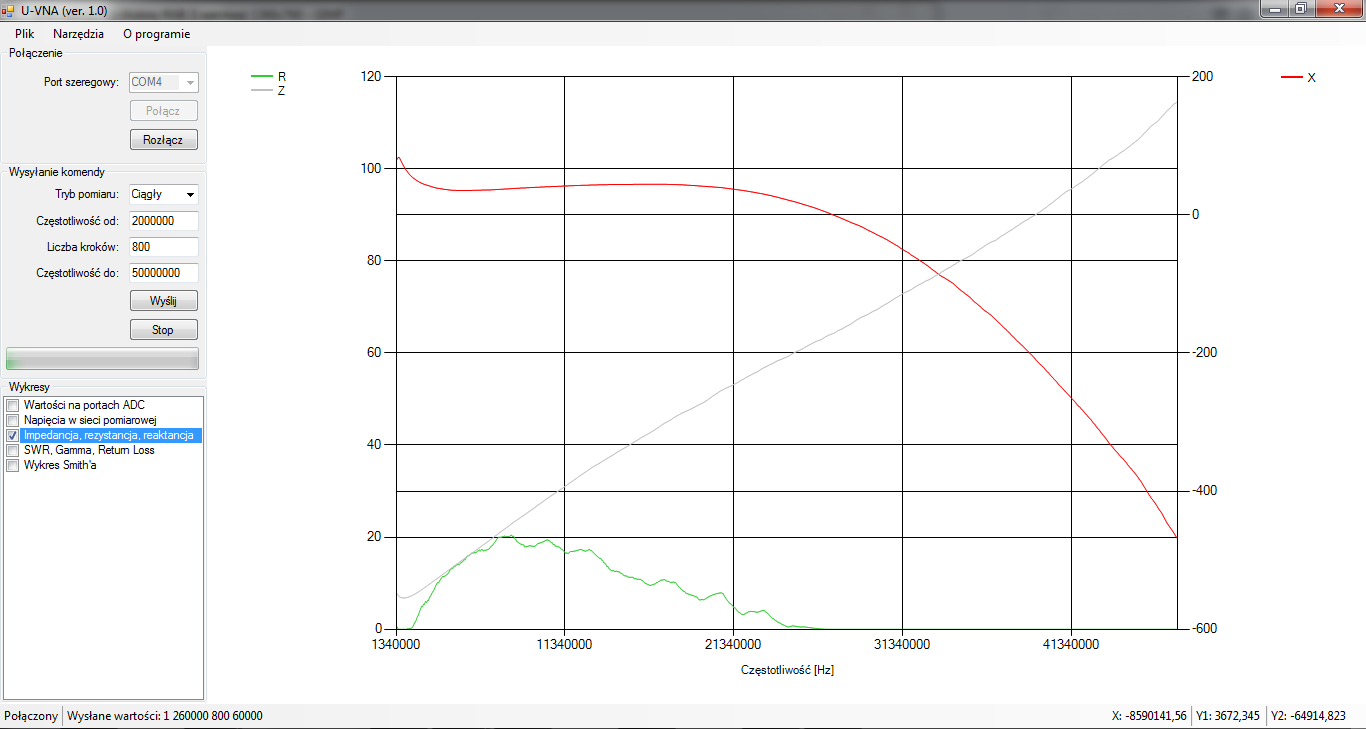 Widać, że wraz ze wzrostem częstotliwości maleje impedancja/reaktancja, co jest pewnie spowodowane pojemnością złącza wyjściowego.